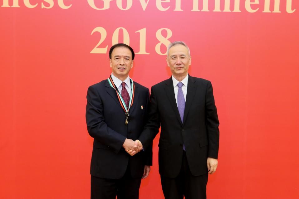 中央政治局委员,国务院副总理刘鹤(右)颁发2018中国政府友谊奖