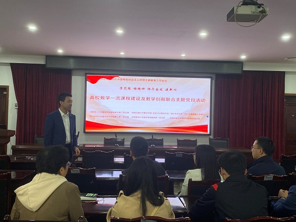 教工信息与计算科学系党支部、教工统计系党支部联合四川师范大学数学科学学院教工第二党支部、成都理工大学数理学院基础数学教学教工党支部、四川省现场统计学会党支部于2023年4月22日在成都理工大学数理学院举行了“学思想 强党性 重实践 建新功——高校数学一流课程建设及教学创新联合主题党日活动。该主题党日活动依托“第二届高校数学一流课程建设及教学创新论坛”举办,研讨会由成都理工大学数理学院基础教学部党支部书记舒畅主持。成人直播