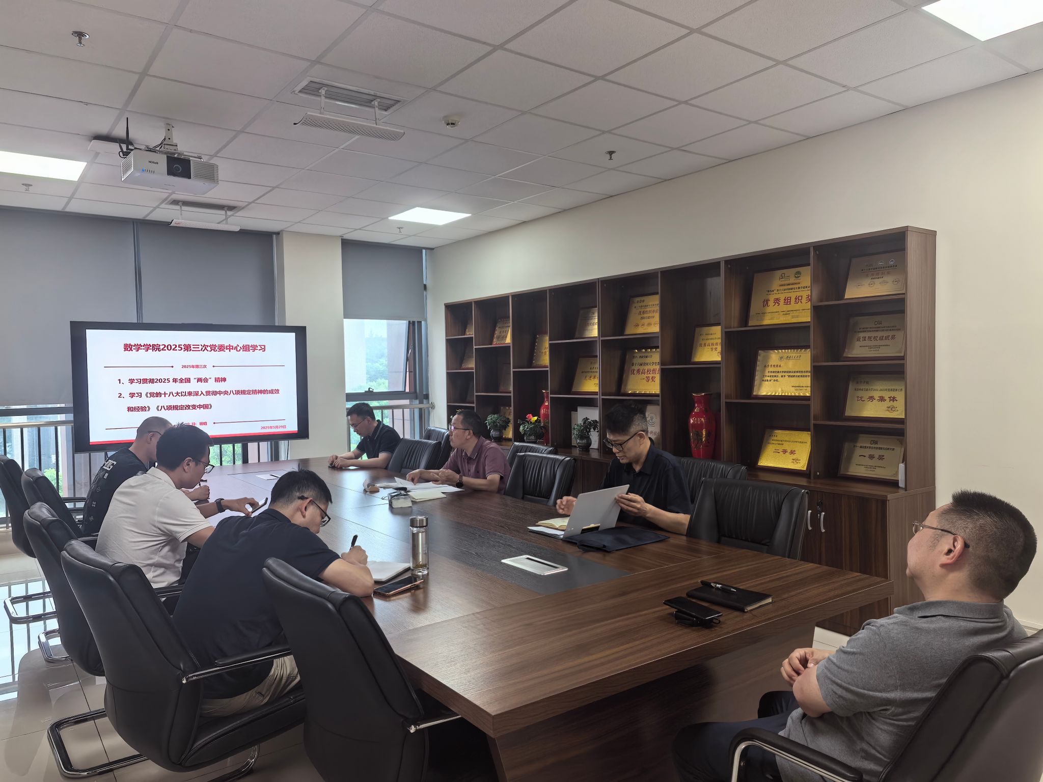 2025年第三次党委中心组集体学习会议在犀浦校区X30429会议室召开。会议由学院院长兼党委副书记杨晗主持并领学,内容是深入学习贯彻2025全国两会精神,深入学习领会党的十八大以来深入贯彻中央八项规定精神取得的显著成效和积累的宝贵经验。学院党政领导班子成员、党委委员等参加了学习。参会人员还结合分管工作谈学习体会和思考。
