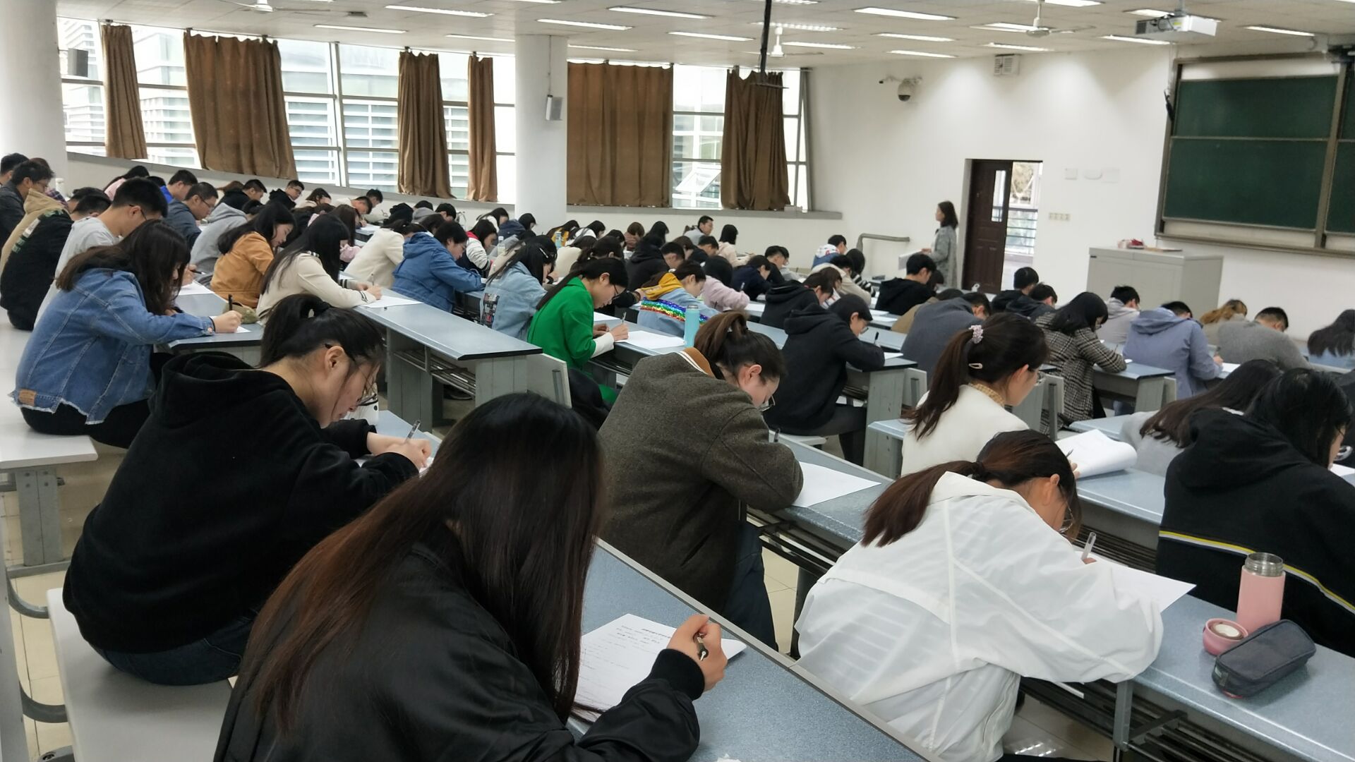 为避免与其他考试时间发生冲突,本次考试的时间从12:30-14:00。12:20左右所有同学已经来到了教室,监考老师安排好考试座位,告知了大家注意事项,五分钟过后,所有同学自觉将资料、手机放在讲台上,老师发放了考试试卷。12:30,考试正式开始,整场考试,同学们全神贯注,非常的认真。