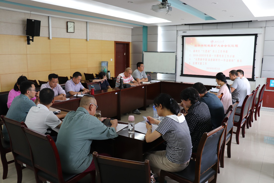 2019年第五次党委中心组(扩大)学习会议在犀浦校区X2511会议室召开。会议由党委书记徐革主持,学院党政领导班子成员、党委委员、纪委委员、系主任和教工党支部书记等参加,认真学习贯彻习近平总书记在“不忘初心,牢记使命”主题教育工作会议上的重要讲话精神。