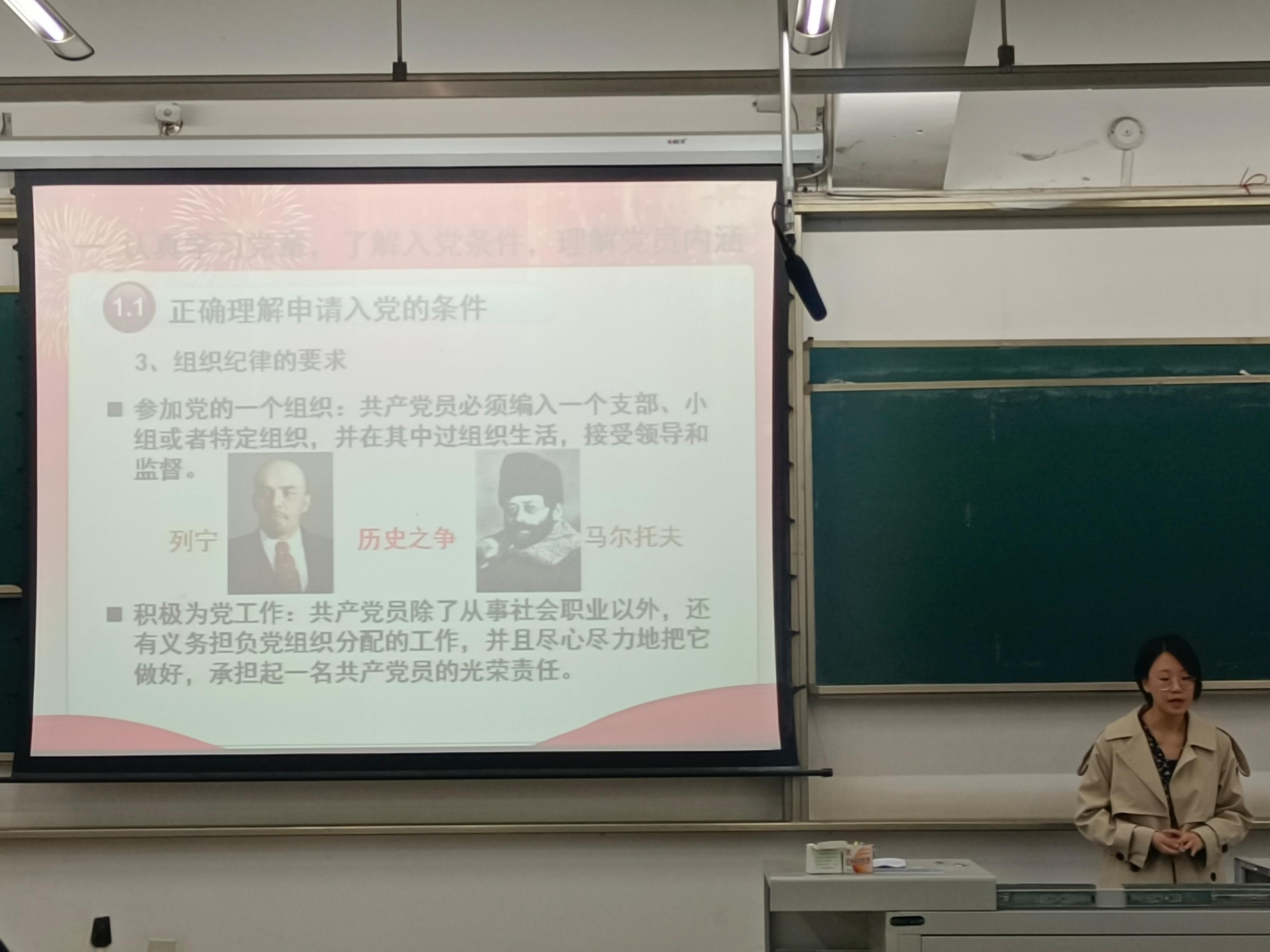 首先,张老师带领我们认真学习《中国共产党章程》第一章第一条的内容,帮助我们正确理解申请入党的条件、充分领会党员的基本条件、明确党员的权利和义务。她强调共产党员是工人阶级的有共产主义觉悟的先锋战士,同时也是劳动人民的普通一员。接下来,张老师向我们介绍了党员发展的基本流程:申请入党,积极分子、发展对象考察培养,接收预备党员的手续与程序。之后,张老师指出党的事业的发展需要优秀青年,积极争取入党是大学生的正确选择。最后,张老师希望在座每一位同学要树立正确的入党动机,在党组织的培养教育下,按照《中国共产党章程》规定,严格要求自己,通过自身的努力早日成为一名合格的共产党员。