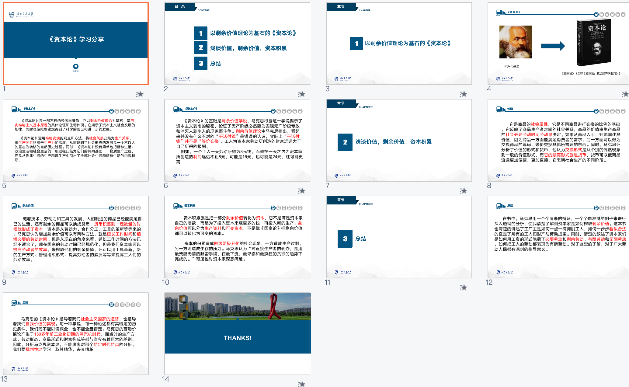 毛智彬同学表示:“资本论所得出的结论具有现实的可预见性和历史前瞻性,论证了资本主义社会逐渐走向灭亡的历史趋势,所以我们要坚定不移地走中国特色社会主义道路。”任敏同学赞同地说道:“我们分析学习《资本论》,一定要结合时代特征,批判性地学习。”