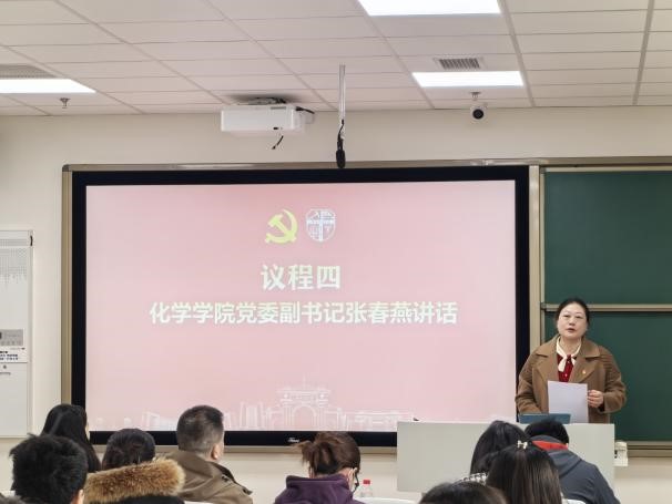 化学学院党委副书记张春燕系统回顾了学院本科生党建发展历程,提出了本次支部共建的两大核心目标,一是加强同理工基础兄弟学院、学科间的沟通交流、互促互进;二是鼓励两学院学生之间加强朋辈引领作用,通过专业课程资源共享、科研竞赛经验分享等,带动学院学生学习进步、全面发展,更好发挥党支部战斗堡垒作用。