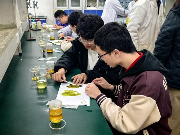 活动现场,化学学院本科党支部成员化身“实验小导师”,组织了两个趣味十足的小实验。在“熔岩灯”实验环节,随着试剂的缓缓注入,五彩斑斓的如梦幻熔岩般翻滚涌动,惊叹于化学物质间奇妙反应所营造出的奇幻景象过程中,带领党员同志们学习到密度、反应速率等化学原理的直观呈现。“叶脉书签”制作环节,党员们小心翼翼地去除叶片表皮,留下精美叶脉,体验化学试剂与自然材料的完美碰撞。