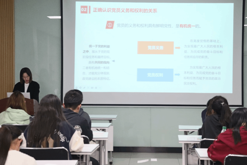 授课中,秦思远老师以《中国共产党章程》为依据,结合案例细致讲解党员八项义务与八项基本权利的具体内容。她从“学习义务”切入,强调理论武装对党员成长的重要性,再到“知情权、参与权”等权利,清晰梳理党员在党内生活中的权责边界。在阐述核心观点时,秦老师着重指出:“党员的义务和权利并非孤立存在,而是相互依存、相互促进的统一体。履行义务是行使权利的前提,行使权利是履行义务的保障,二者缺一不可,共同构成党员行为的完整准则。”