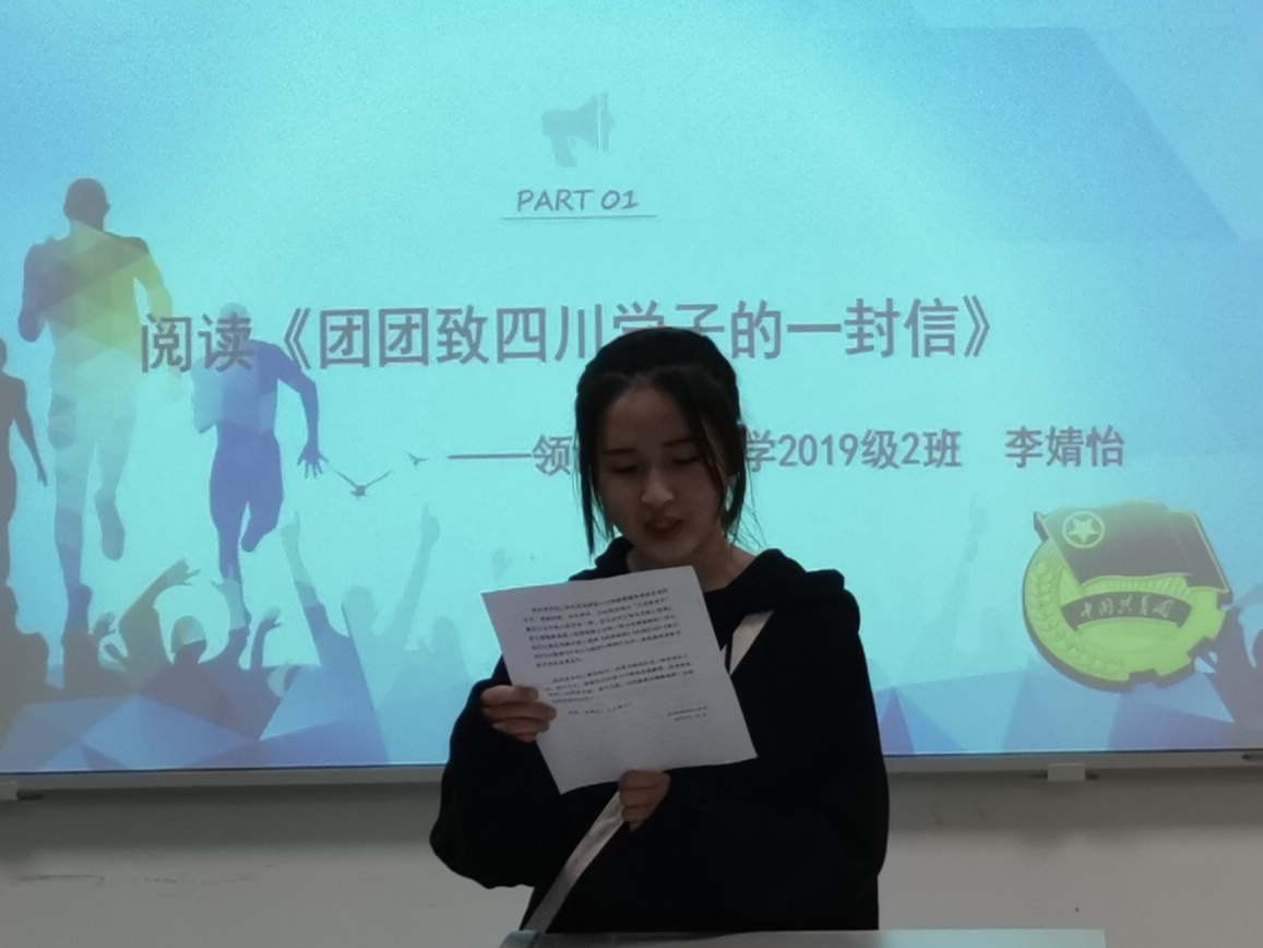 团课伊始,副团支书李婧怡同学朗读《团团致四川学子的一封信》,这让同学们深深感受到了祖国对我们青年殷切的期许。