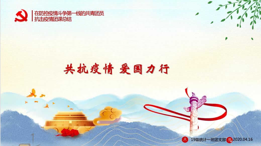 统计学2019级1班团支部于4月16日下午两点通过腾讯会议成功开展了以“共抗疫情,爱国力行”为主题的线上团日活动,号召支部团员青年为决胜疫情防控阻击战贡献青春力量。团日活动由组织委员张思润主持,支部全体团员青年积极参与,支部分管团干部学院团委兼职副书记周义杰到会参加。