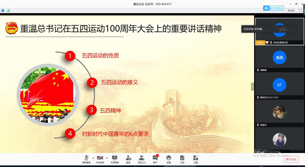 应用数学2018级2班团支部于2020年4月24日在线上开展了以“共抗疫情·爱国力行”为主题的团日活动,支部全体团员参与。团委“1+100”支部对接团干部林玉受邀参与活动。
