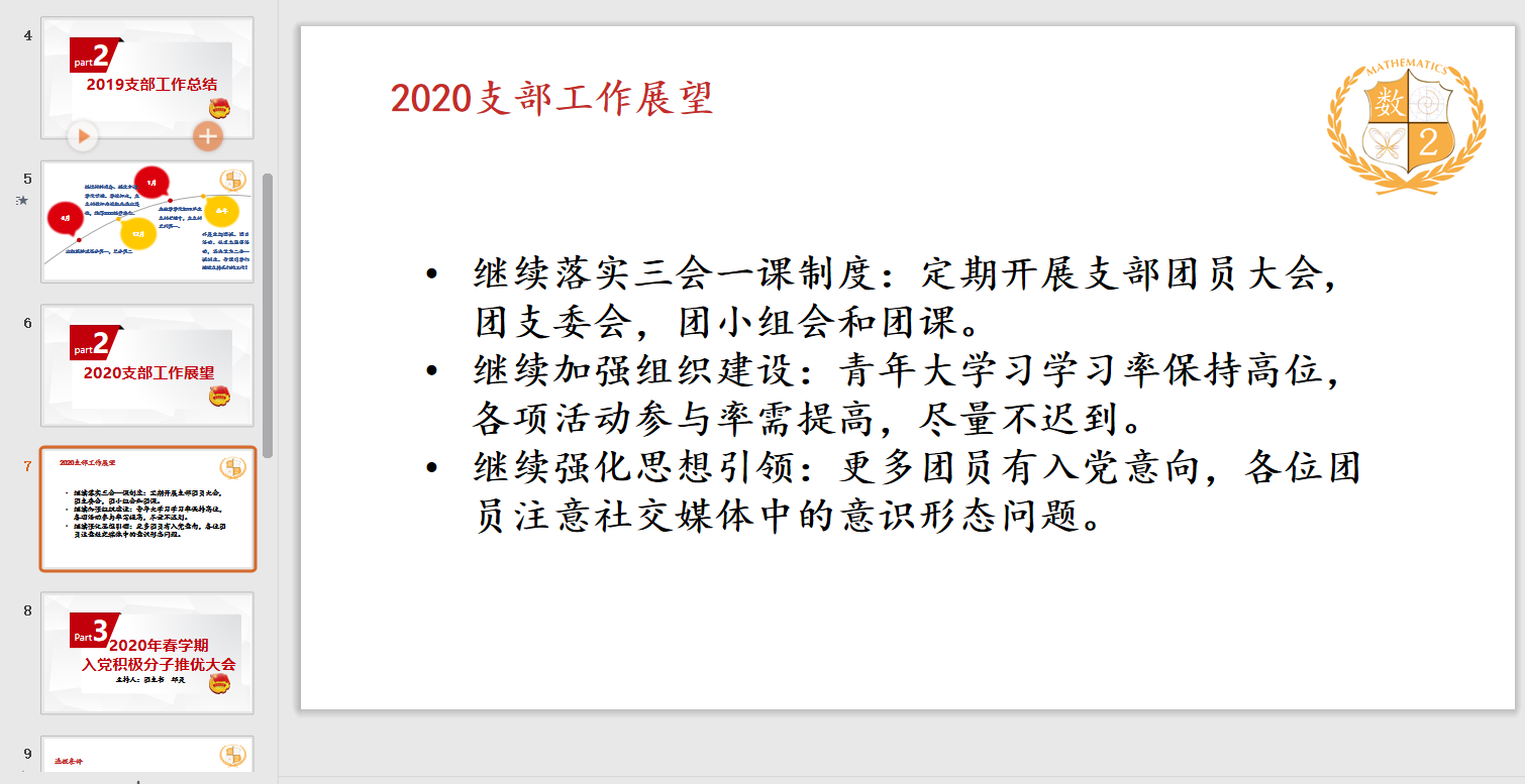 随后,安禾嘉对2020年支部工作做出展望。他强调,要继续落实“三会一课”制度,定期开展支部团员大会,团支委会,团小组会和团课;要继续加强组织建设,支部团员积极参与“青年大学习”和各项活动;要继续强化思想引领,牢牢把握意识形态的问题。