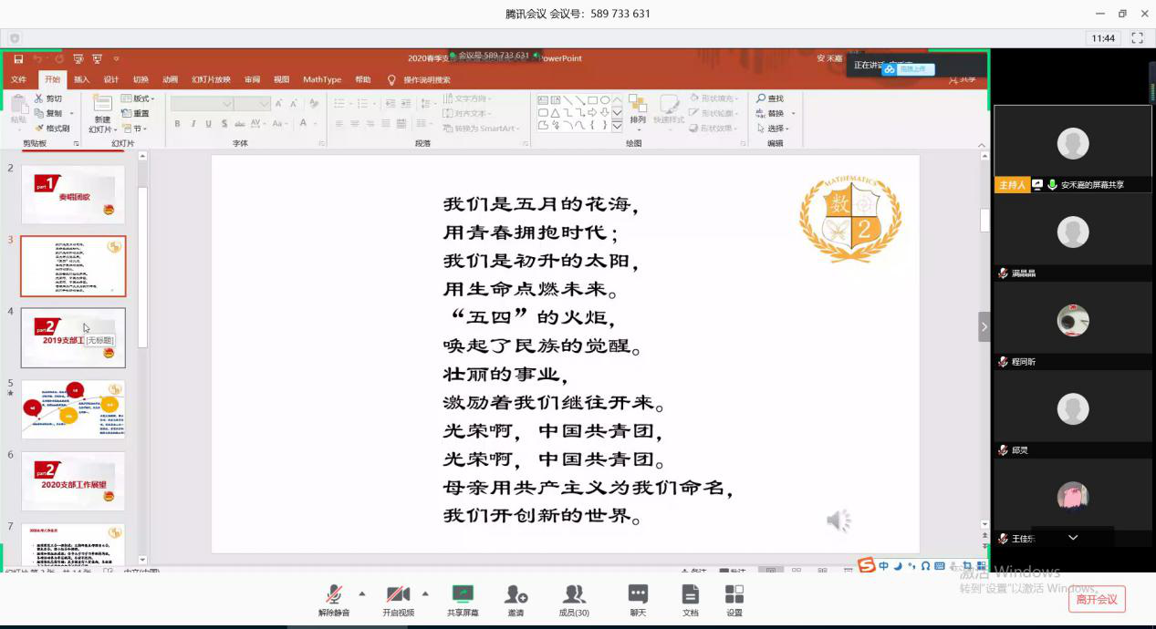 应用数学2018级2班团支部于3月25日开展了2020年春学期第一次团员大会暨积极分子推优大会。大会主题为“青春心向党·建功新时代”,由团支书邱灵、副团支书安禾嘉主持。除特殊情况外,支部全体团员参加会议。团支部“1+100”负责人,学院团委组织部部长林玉受邀参加本次会议。