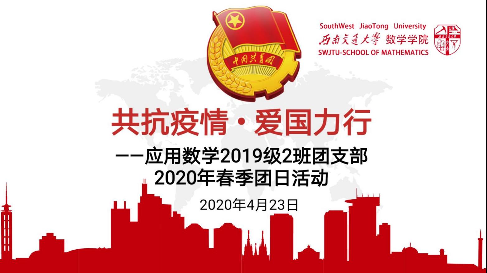 为深入学习贯彻习近平新时代中国特色社会主义思想和党的十九大精神、习近平总书记关于打赢新型冠状病毒感染肺炎疫情防控阻击战的重要指示精神,引导支部团员牢固增强“四个意识”、坚定“四个自信”、坚决做到“两个维护”,在特殊时期积极应对疫情、落实防疫举措、强化思想引领、加强主题教育,根据学院团委要求,应用数学2019级2班团支部于2020年4月23日下午2时开展了2020年春季“共抗疫情·爱国力行”主题团日活动。本次线上团日活动由班长刘昱伯主讲,支部24名团员均准时参加。团支部“1+100”负责人郑艺梅受邀参加活动。