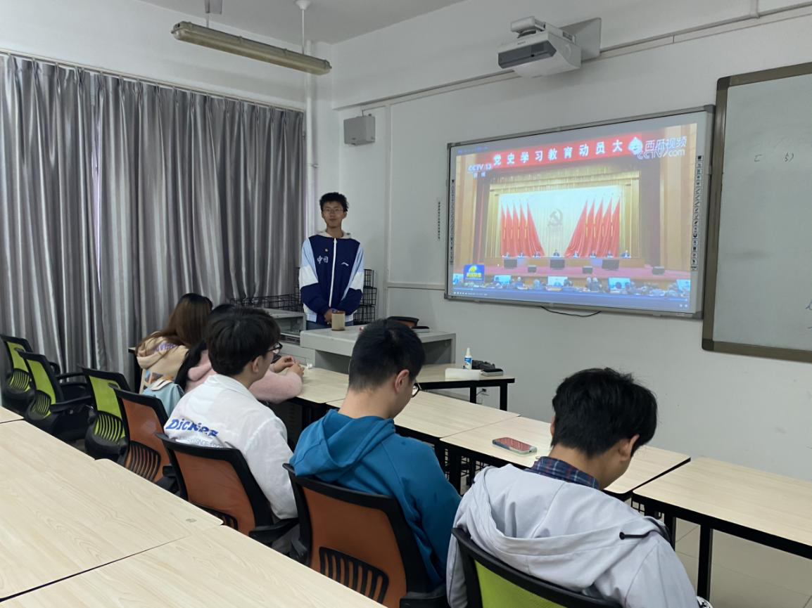 团课第二项,在团支书的组织下,大家先后观看了两个视频。第一个视频讲述了中国共产党成立100周年以来克服的重重艰难险阻;第二个视频是习近平总书记在党史学习教育动员大会上的讲话。习近平总书记强调,要学党史,悟思想,办实事,开新局,以优异成绩迎接建党100周年。
