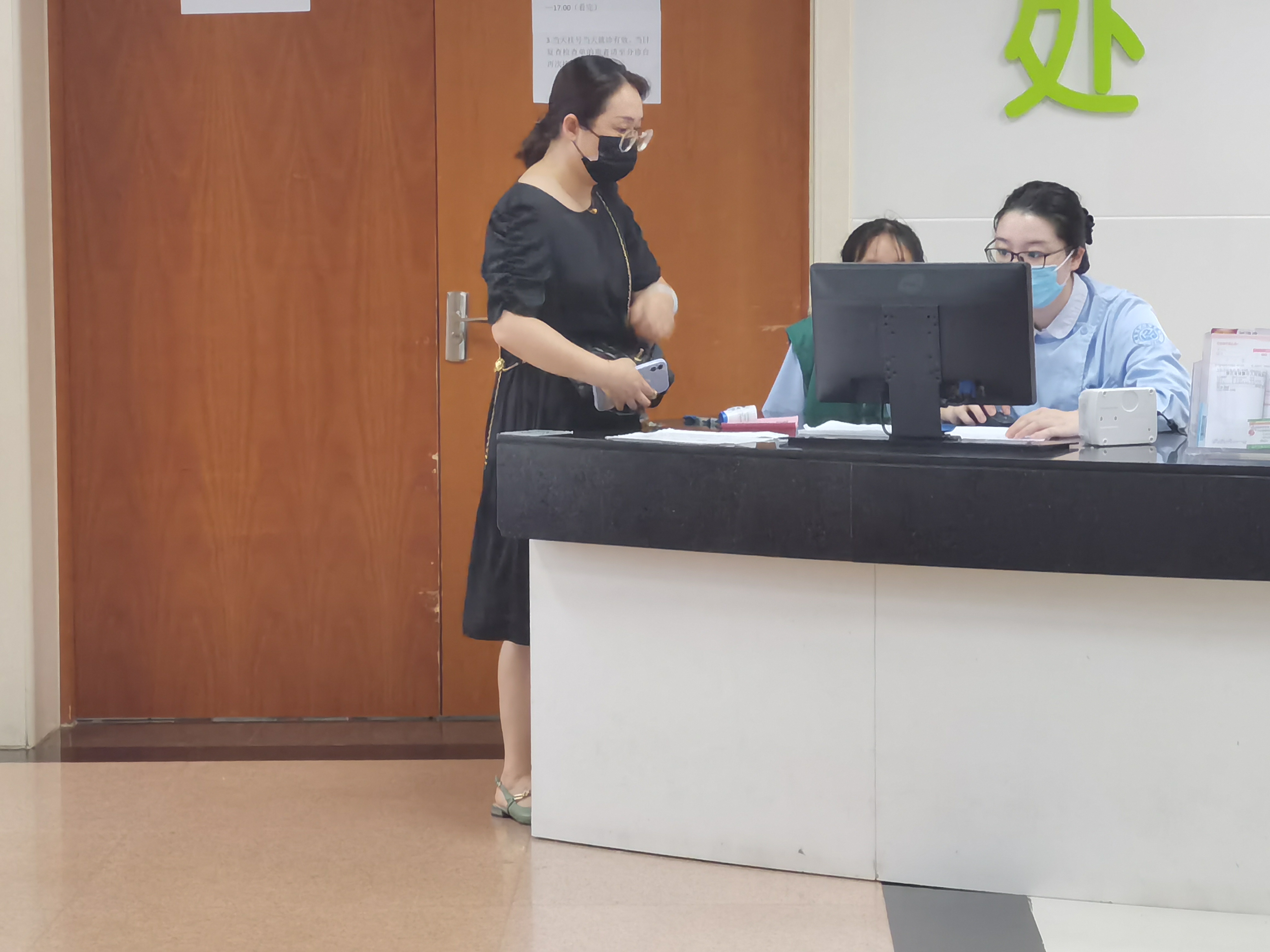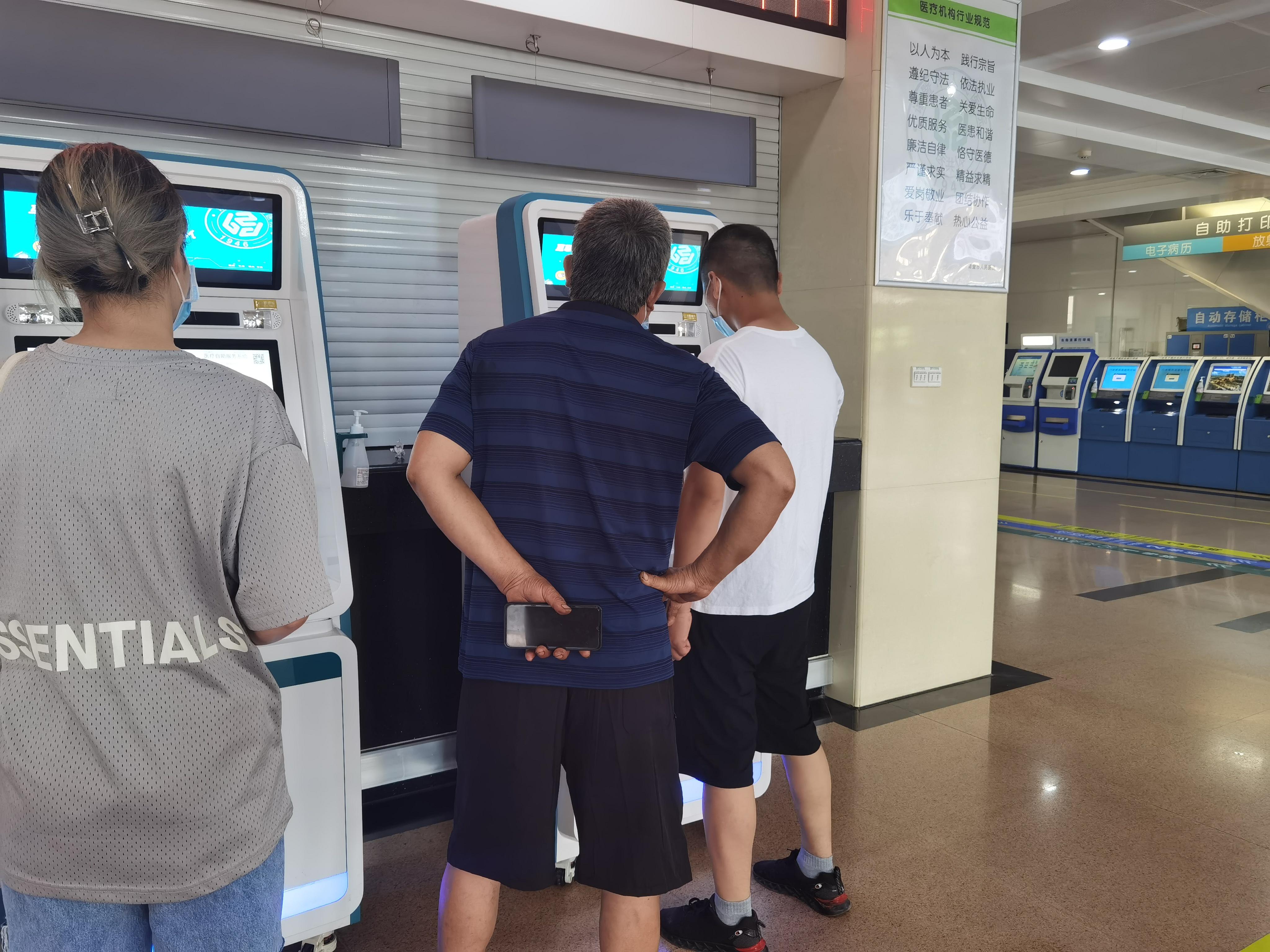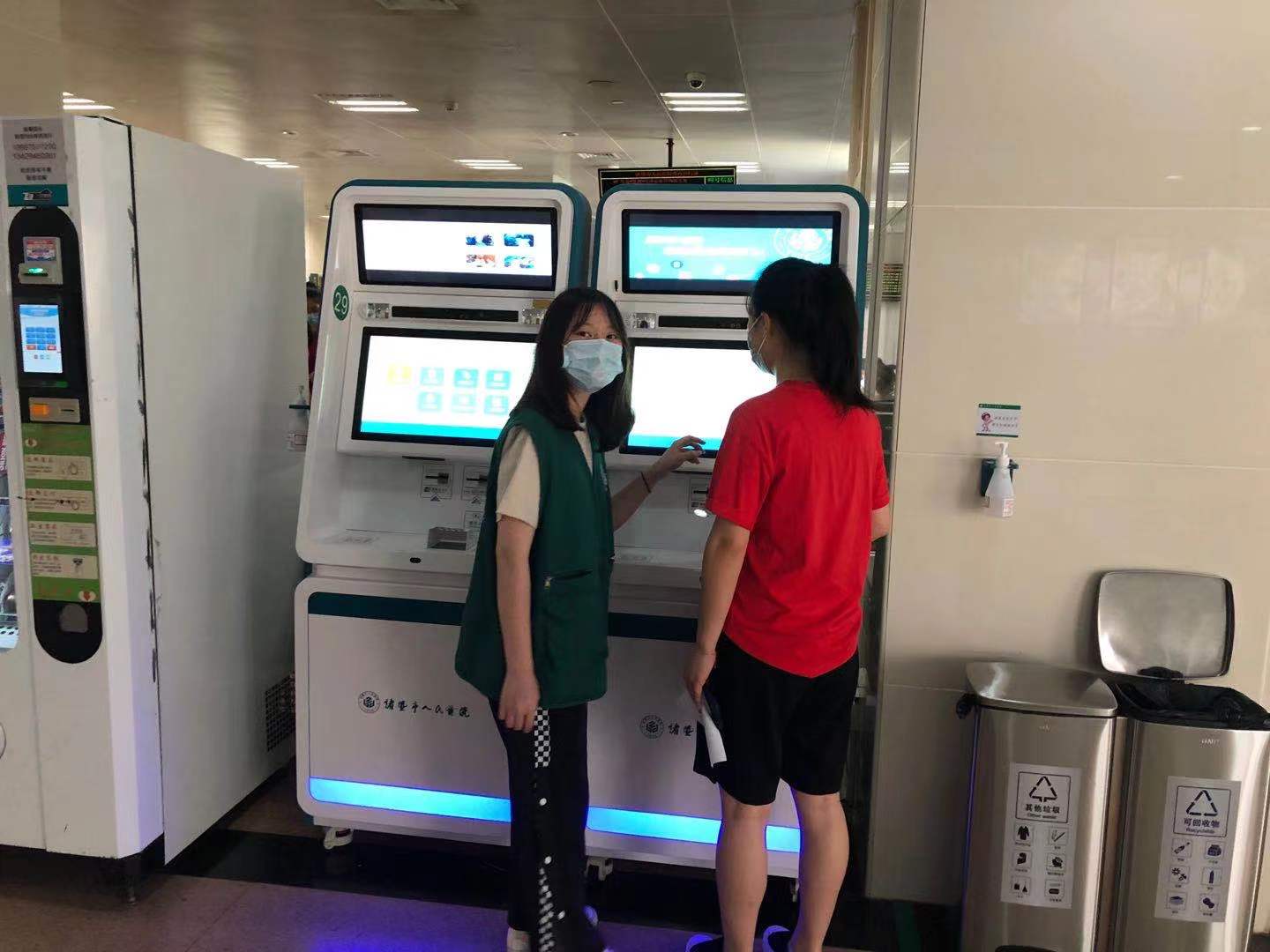 7月13日,队员们在医院集合后来到了门诊大厅的志工服务台。同学们在预约挂号机旁为不会操作的老年患者提供自助挂号服务,为无人陪护的患者打印领取化验单。因为在第一天掌握了相关专业性知识,同学们基本上能够解答前来就医者对各项服务项目的疑惑,带领患者到门诊诊室。在遇到前来咨询健康问题的患者时,若自己无法回答,就为其选择自助预约服务机器中的具体科室和就医方式。