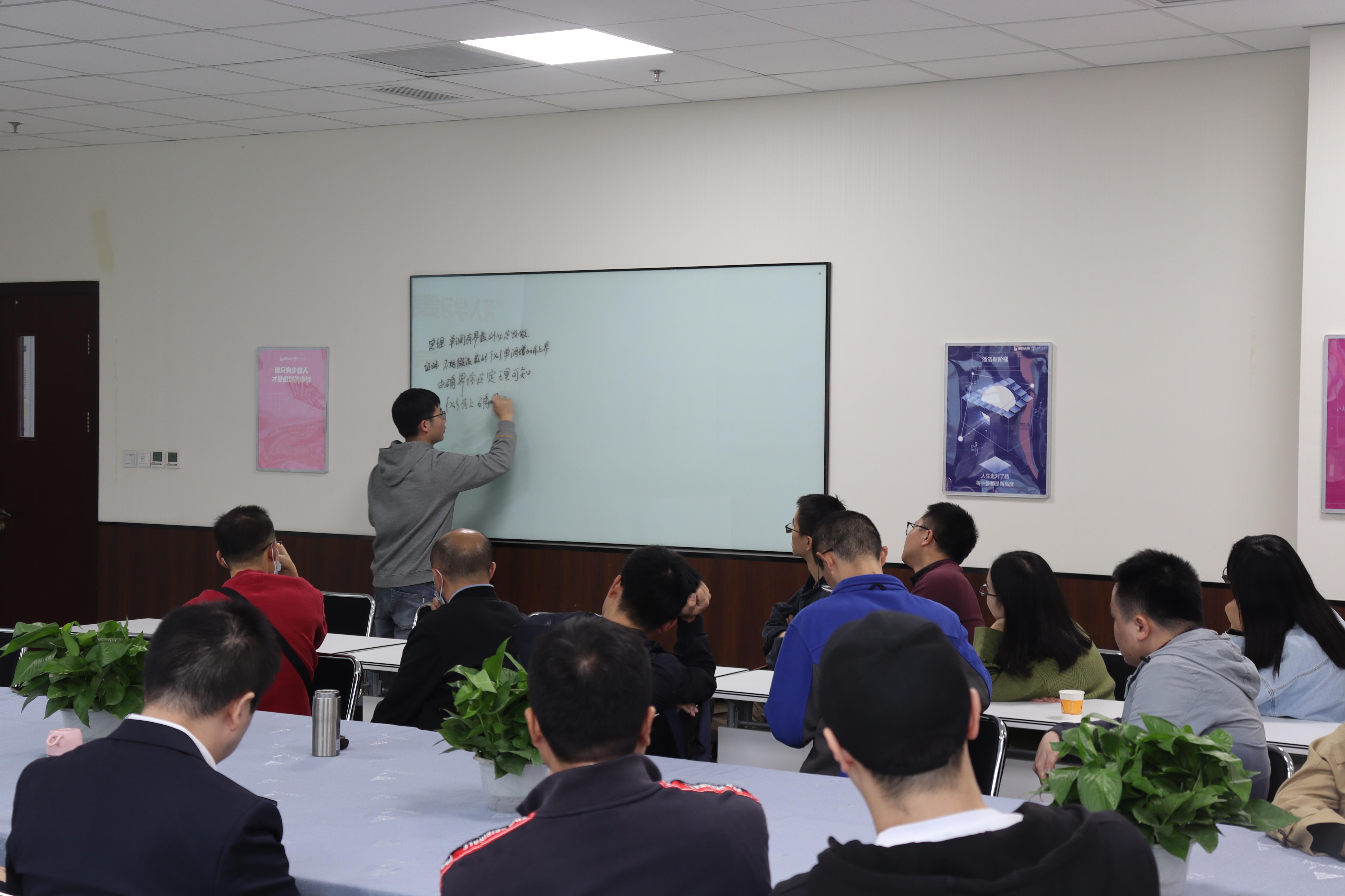 新入职青年教师进行自我介绍。十位青年教师依次登场,他们分别是杨萌、但业星、鲁东、龚桂琼、彭英萍、张鹏飞、张洪钒、冯雨露、康剑豪、洪思奥。在介绍的环节中,各位青年教师就自己来到交大之后,在工作和生活上受到的来自学院和各位老师的帮助表示了感谢,并向在座的各位老师分享了自己成为交大一员后的所见、所思、所感、所想。龚桂琼老师讲道,“我感觉自己真的是来到了一个温暖有爱的大家庭”。彭英萍老师讲道,“我在这里工作一整年,我感觉自己的幸福感很爆棚。”在青年教师介绍环节的最后,康剑豪老师为在座的老师讲解了自己关于数列极限这一课题上的理解。台下的老师们对康老师的授课给予充分肯定并提出了相应的指导意见。