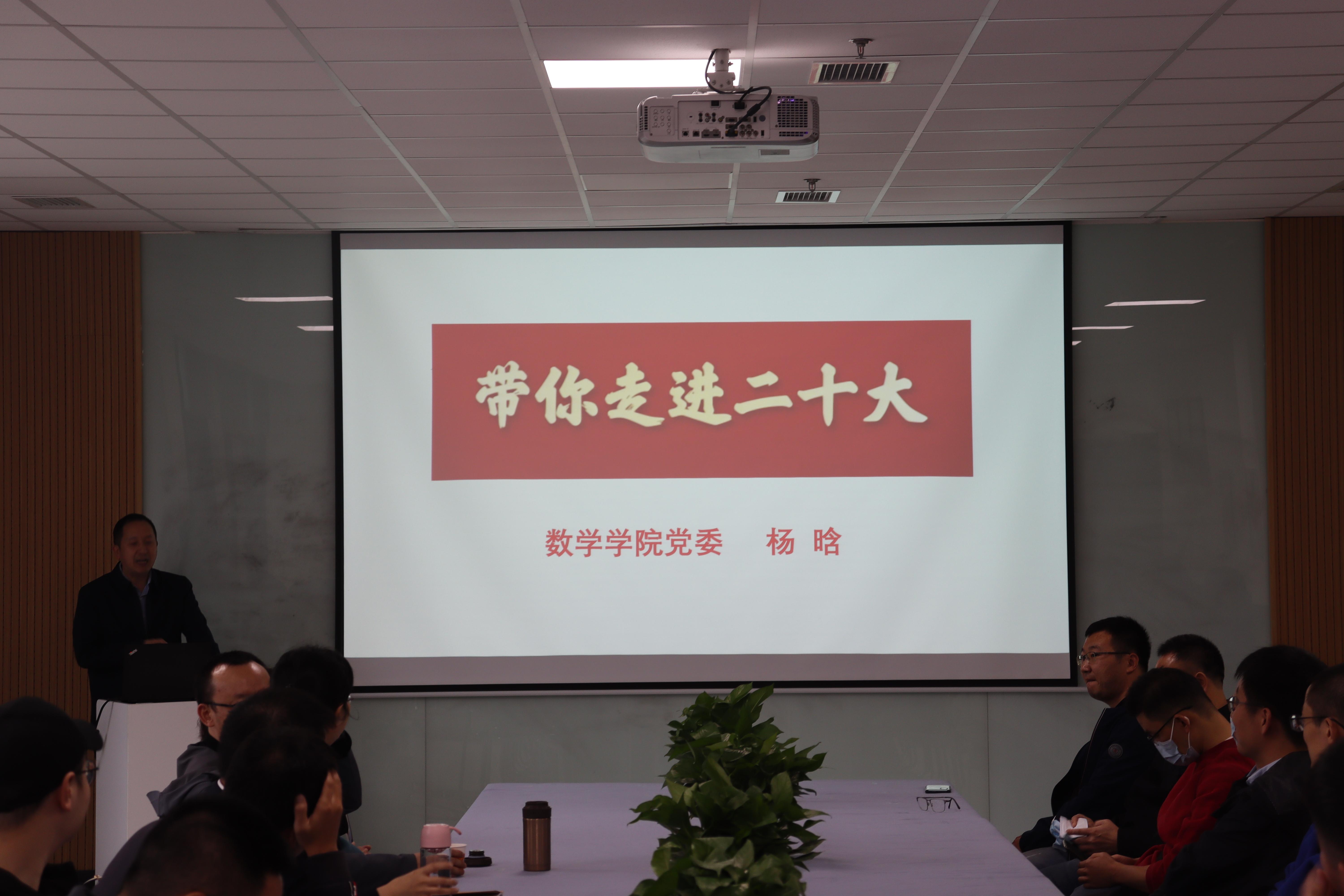 活动伊始,杨晗院长以刚刚召开的二十大为切入点,以数学人的角度来解读二十大的报告内容。在这次讲话中,杨晗院长提到了大会主题、三个务必、三件大事、中心任务等内容,这些均与党的二十大报告所提出的中国式现代化息息相关。杨晗院长用生动的口吻为在座的各位老师讲述了在二十大报告中出现的关于中国式现代化的“五个特色”、中国式现代化的本质要求和如何实现中国式现代化这一战略性目标的内容。除此之外杨院长重点谈到了二十大报告中对教育工作的重视,并以此为切入点,着重强调了高校教师应该将教书育人作为工作中的主要职责。同时,杨院长特别谈到了教育研究部门对基础研究工作的大力支持,他叮嘱各位青年教师作为成人直播