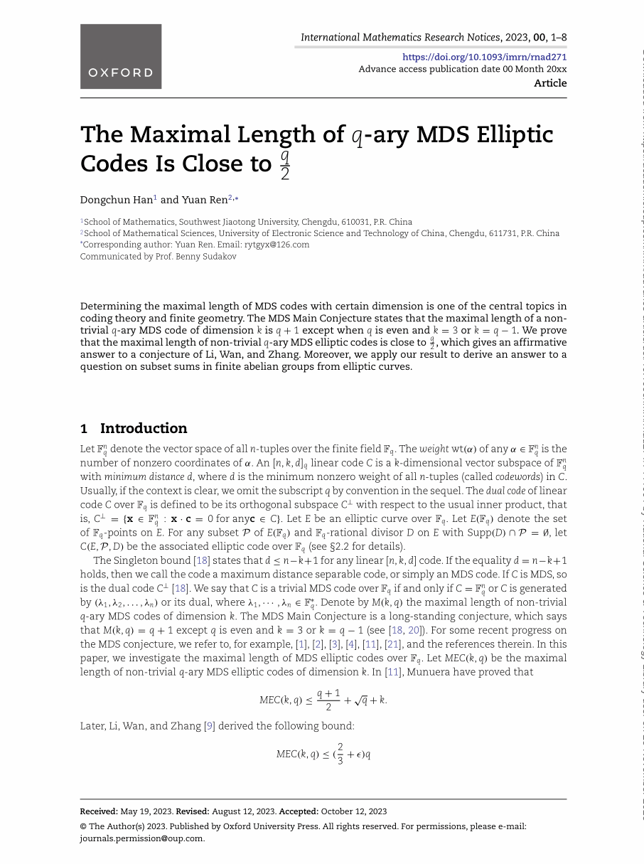 数学与信息交叉团队副教授韩冬春博士以第一作者在国际高水平综合类数学期刊《International Mathematics Research Notices》上发表论文《The maximal length of q-ary MDS elliptic codes is close to q/2》。《International Mathematics Research Notices》是国际著名的高水平综合性数学期刊,由牛津大学出版社出版,旨在发表“当代数学热点研究领域的高质量研究成果”,是中科院SCI期刊数学1区top期刊。