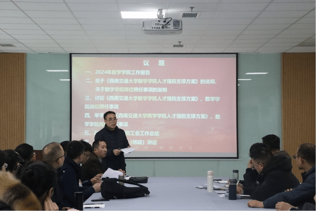 工作报告及相关方案介绍。他指出,学院将依据科研、教学、服务三个方面的综合考核来选拔优秀教师。接着,杨晗院长阐述了学院在本年度学术科研、学科竞赛、教学改革、教师获奖、招生宣传等方面所取得的成绩。其中,学科竞赛作为学院的一大亮点,需落实相关工作部署,积极服务于数院作为教学大院的人才支撑建设。杨晗院长着重强调,数字化战略既是国家的政策导向,也是时代的要求,学院应积极运用数字化的技术、思路、模式和方法推动自身建设,同时鼓励教师踊跃参与教材编写,为教学提供有力支持。