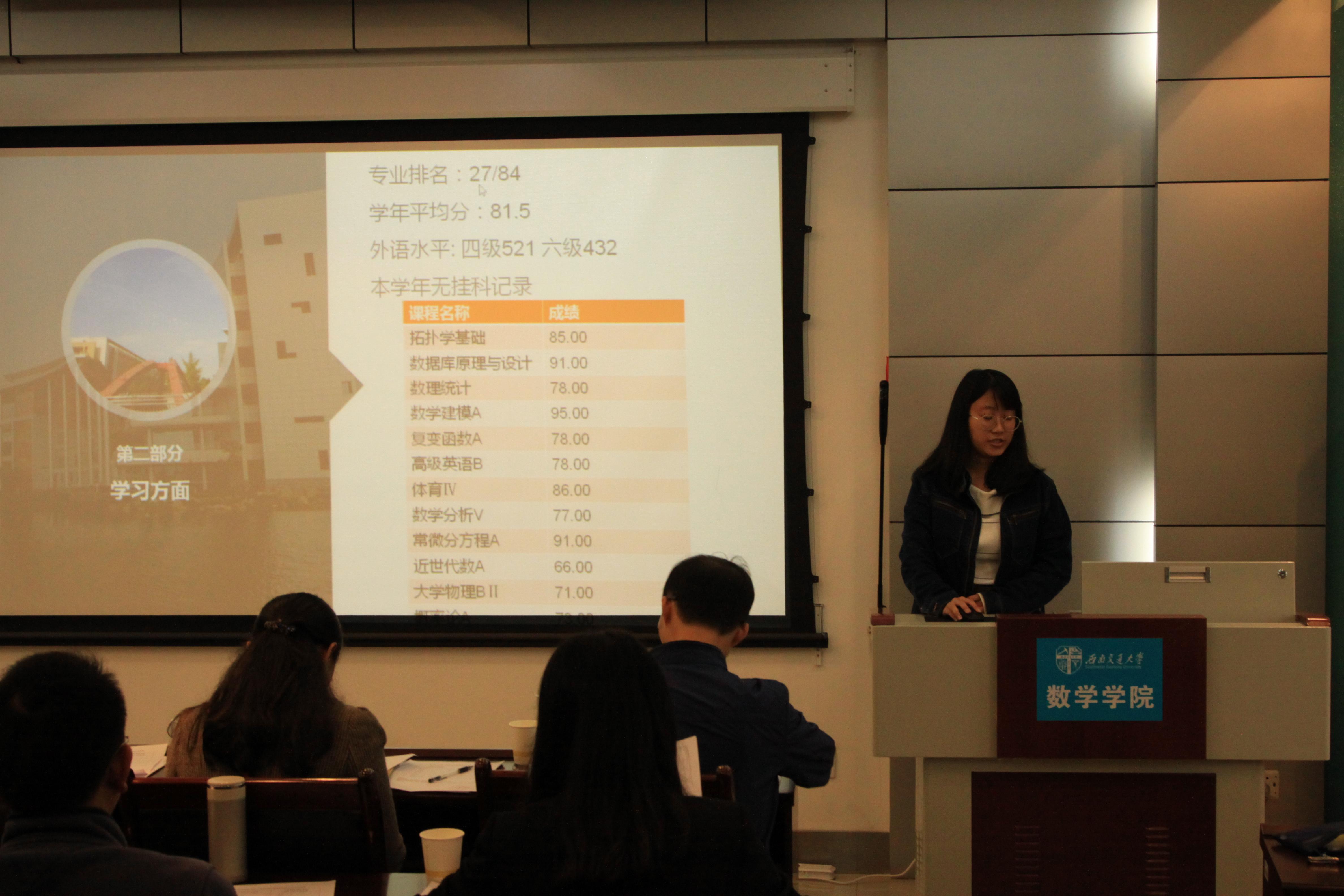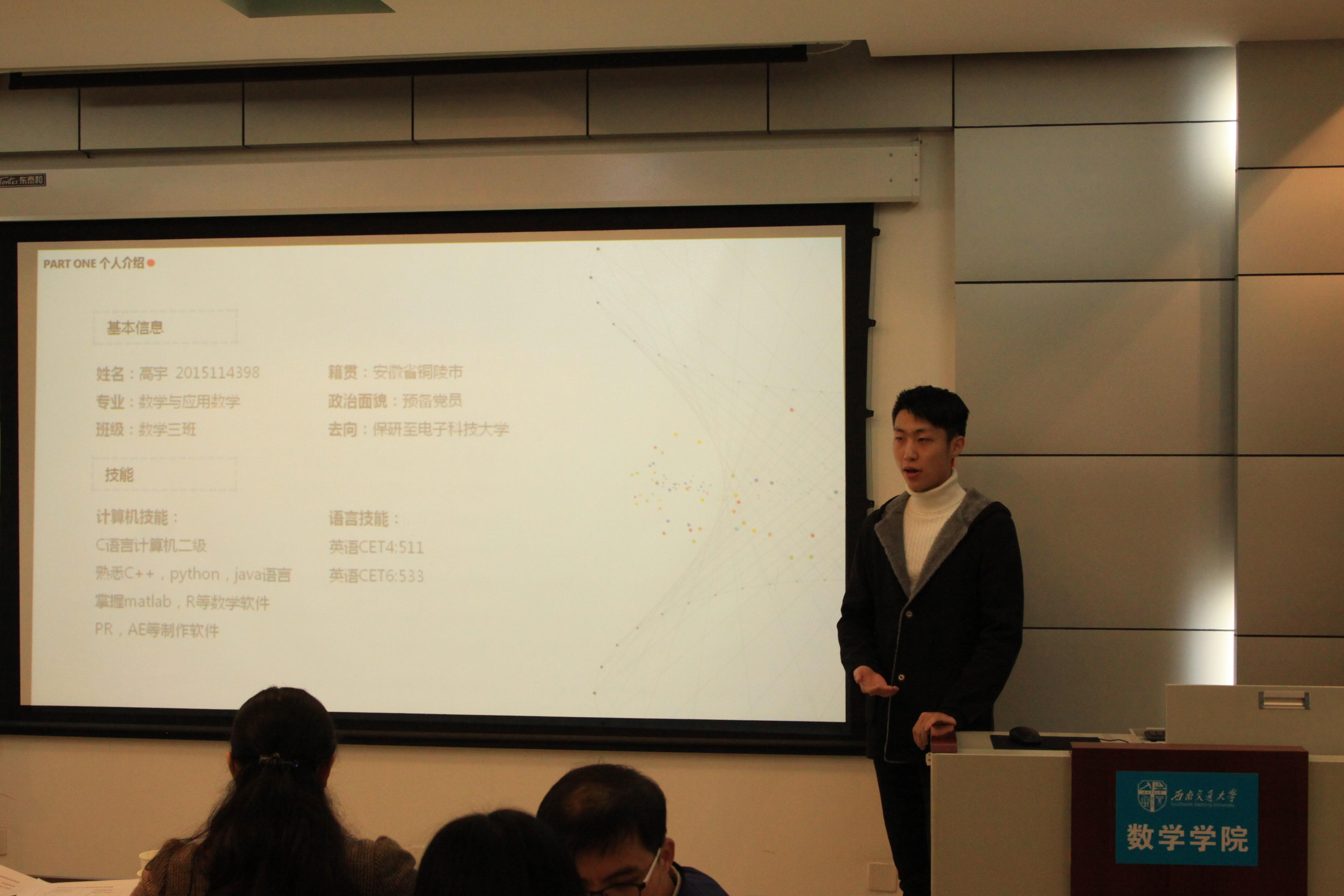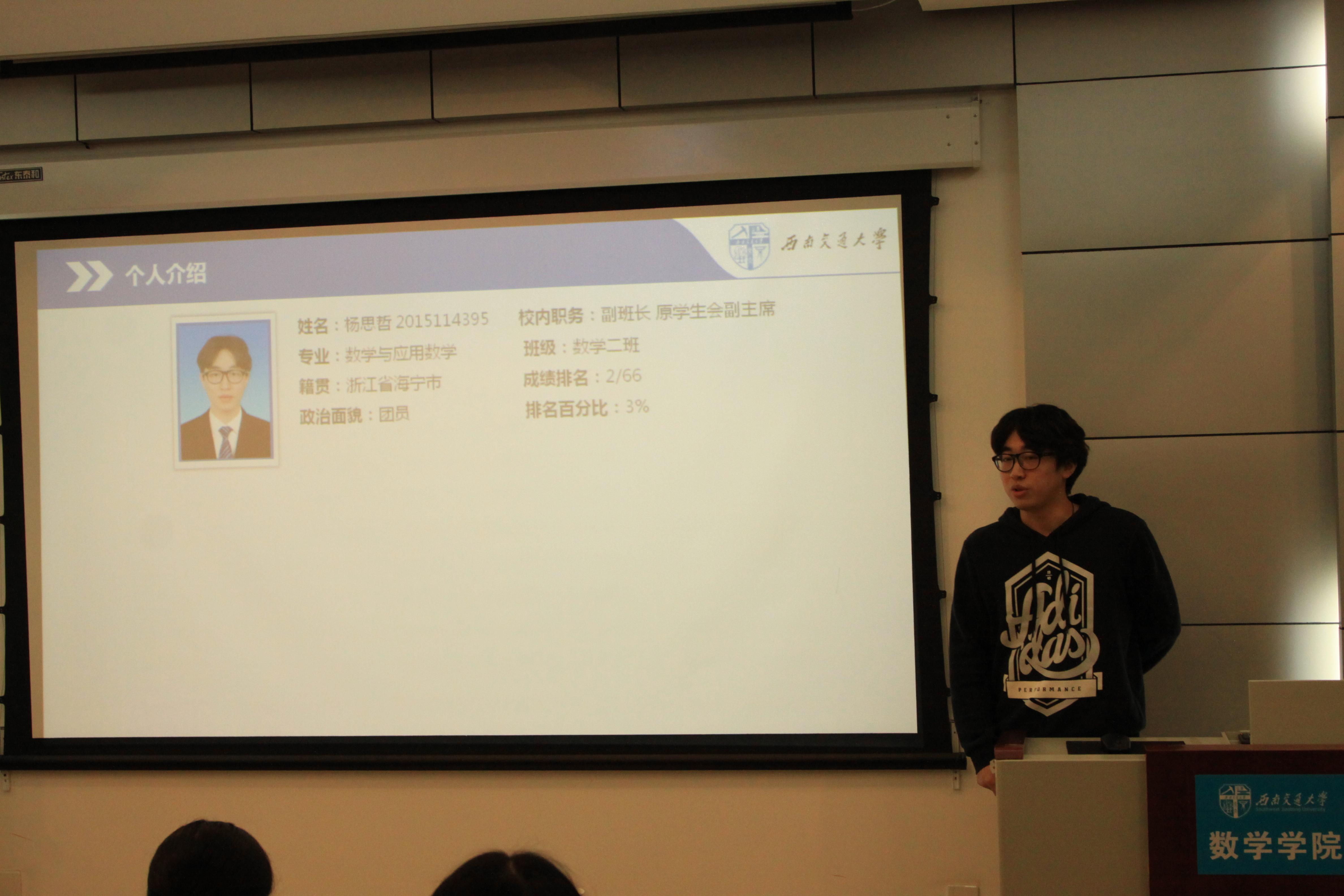 之后进行的是极客数学帮助学金的评定答辩,答辩者介绍了自己的家庭经济情况,也展示了自己在学校取得的一些优异成绩,同时表达了自己在日后继续奋发向上的决心。