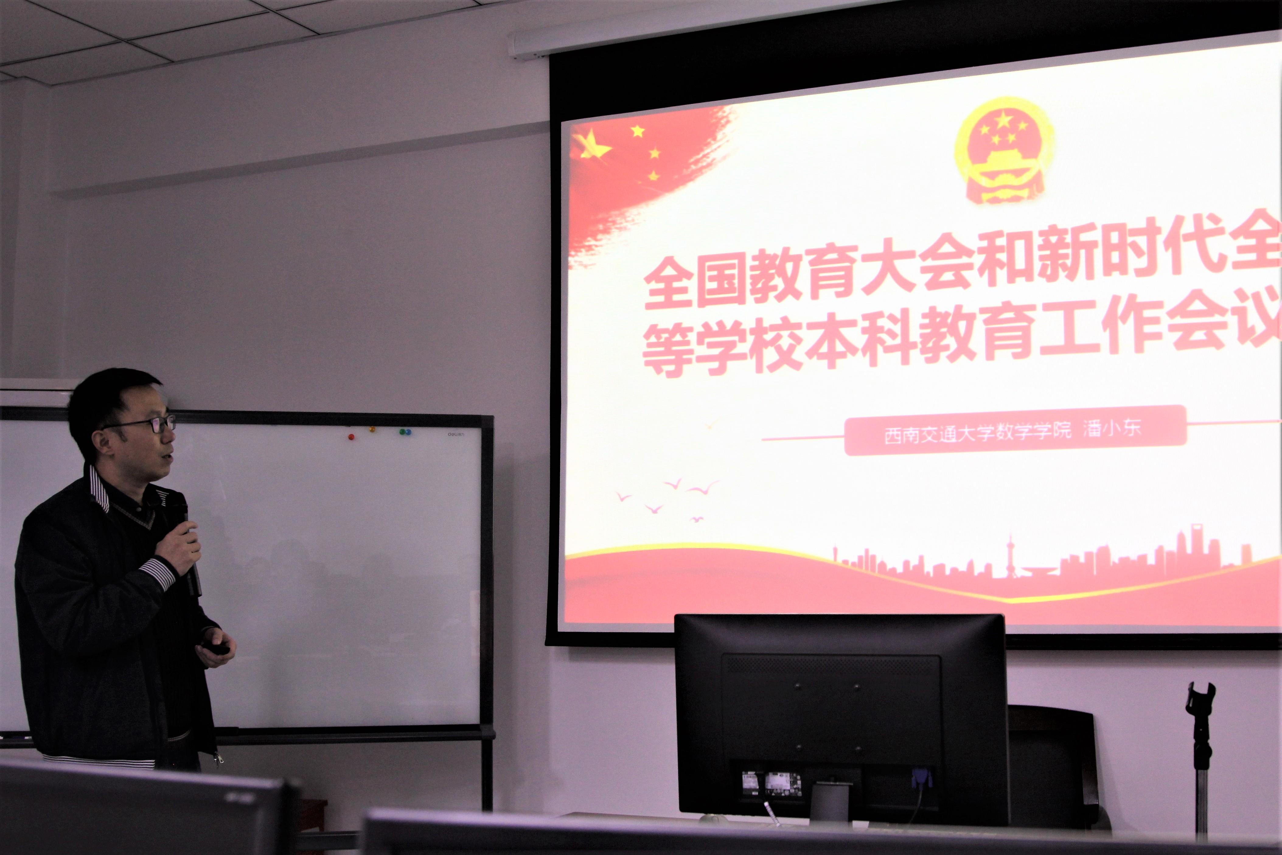 紧接着潘小东副院长做了教育部一系列文件和会议精神学习的专题报告。首先,潘小东副院长对习近平总书记在全国教育大会上的重要讲话进行了全文解读。其次,传达了《关于高等学校加快“双一流”建设的指导意见》文件精神,传达了陈宝生部长在教育部“双一流”建设现场推进会的讲话精神。第三,带领所有参会人员学习了《关于加快建设高水平本科教育 全面提高人才培养能力的意见》(以下简称“高教40条”)等文件。潘小东副院长对“高教40条”的目标进行总结,强调要围绕全面提高人才培养能力这个核心点、加快形成高水平人才培养体系,培养德智体美劳全面发展的社会主义建设者和接班人,并从五个方面对学院本科教育教学近期开展的重点工作进行思考和安排部署。