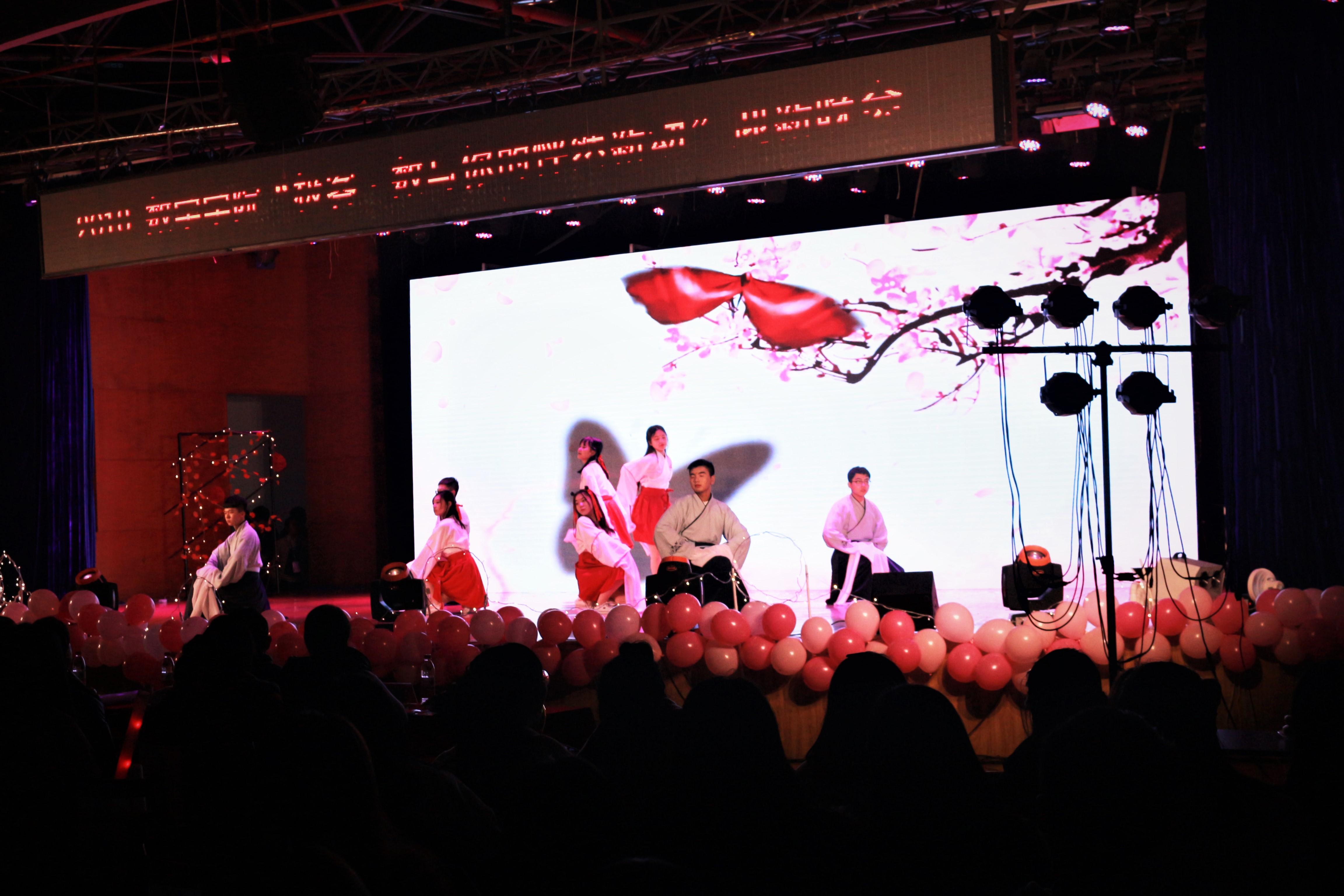 随后迎新晚会节目表演正式开始。第一个节目是应数二班的舞蹈表演《倾杯》,伴随着欢快美妙的音乐,应数二班的同学在舞台上利用水袖婀娜起舞。第二个节目是由17级辅导员谢童心老师与17级统计二班胡皓量同学带来的粤语合唱《可惜我是水瓶座》,观众沉浸在优美的歌声中,尽情享受这天籁之声。