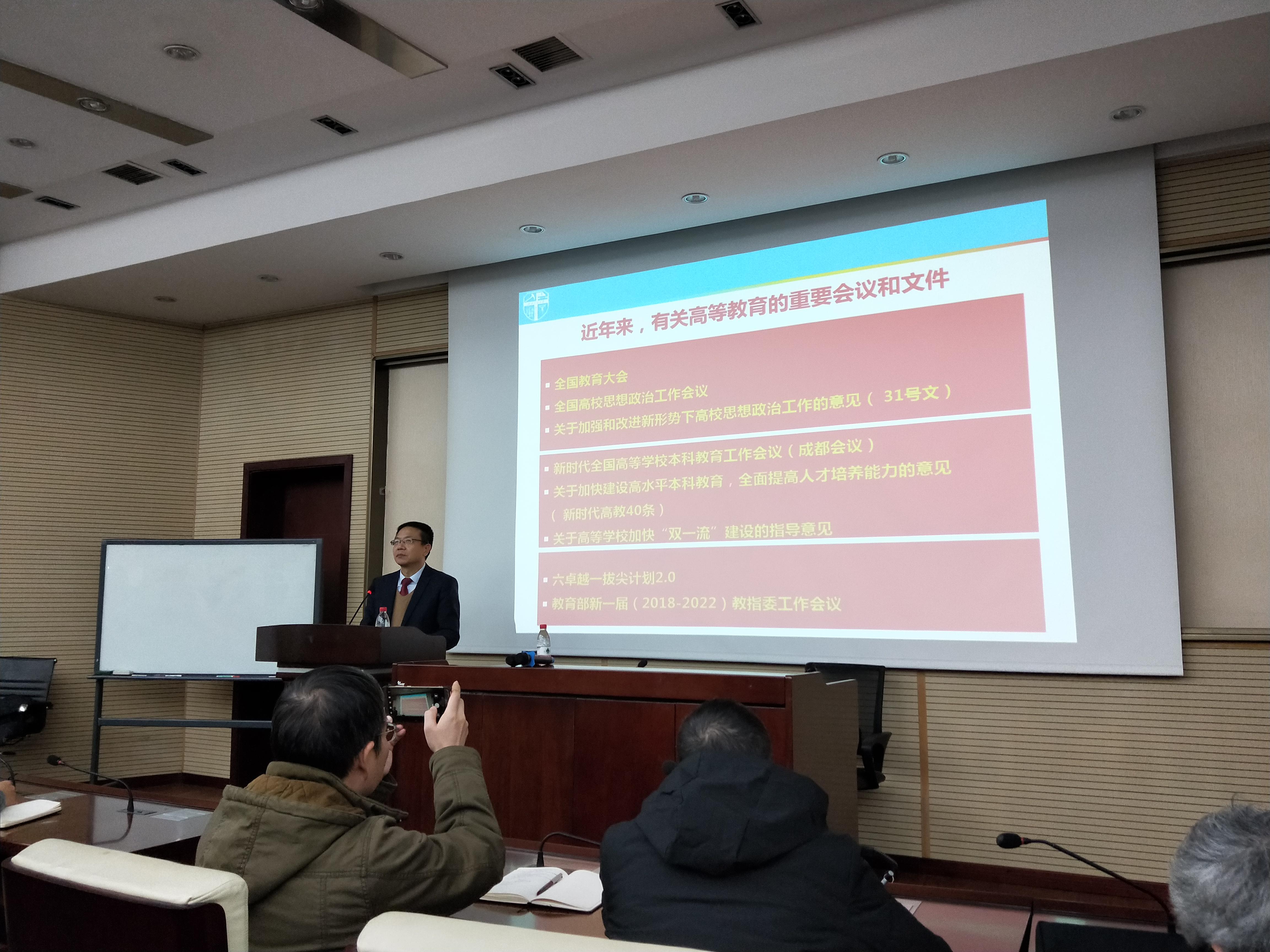 党课培训第一项,徐飞校长简要地阐释了本次党课培训的主题——“坚定理想信念,正确认识世界和中国大势”,并为大家解读了近年来有关高等教育的重要会议与文件。“不谋万世者,不足谋一时;不谋全局者,不足谋一域。”徐飞校长旁征博引,强调了要从战略的、宏观的、全局的角度去看待问题。同时,徐飞校长分析了新时代全国高等学校本科教育工作会议、《关于加快建设高水平本科教育,全面提高人才培养能力的意见》、《关于高等学校加快“双一流”建设的指导意见》等,谈到了“四个回归”,即回归常识、回归本分、回归初心与回归梦想,强调要“以本为本”,做到胸怀祖国,放眼世界,能够跳出教育看教育,跳出中国看中国。