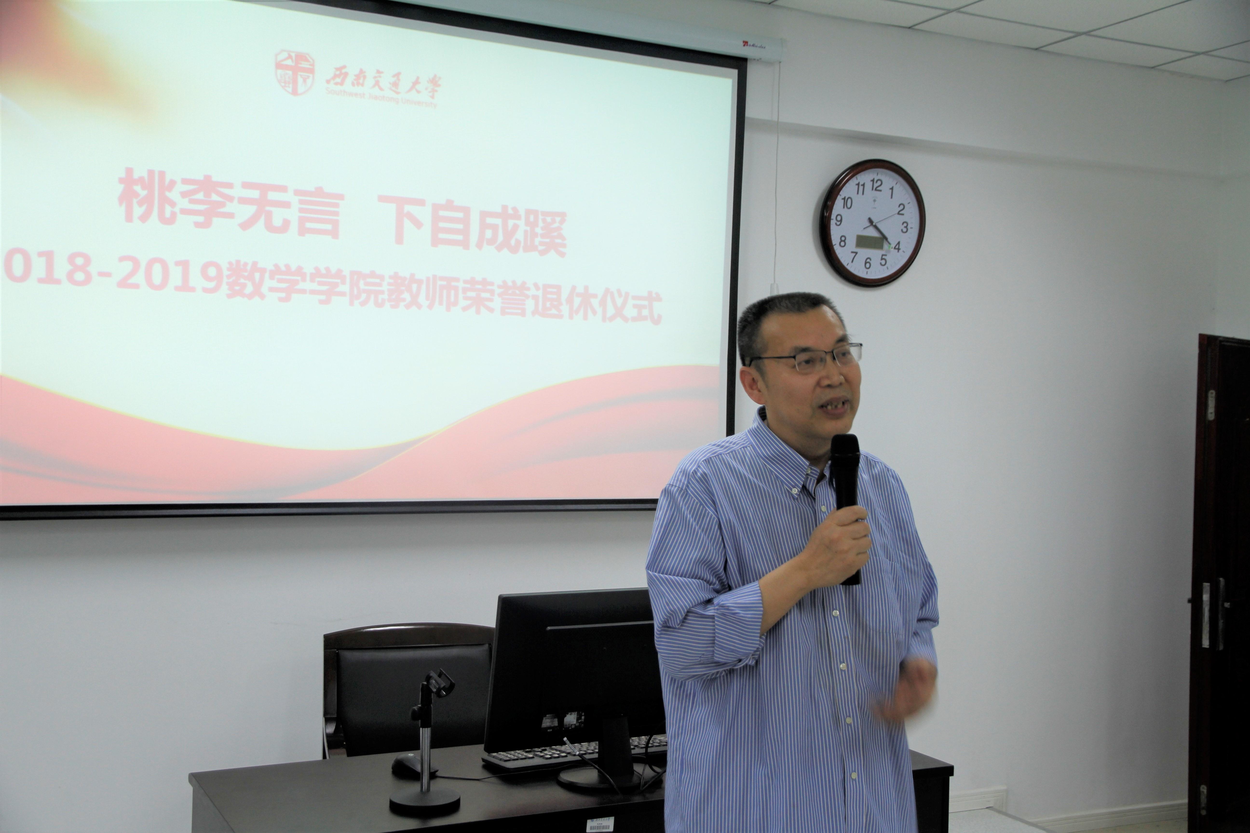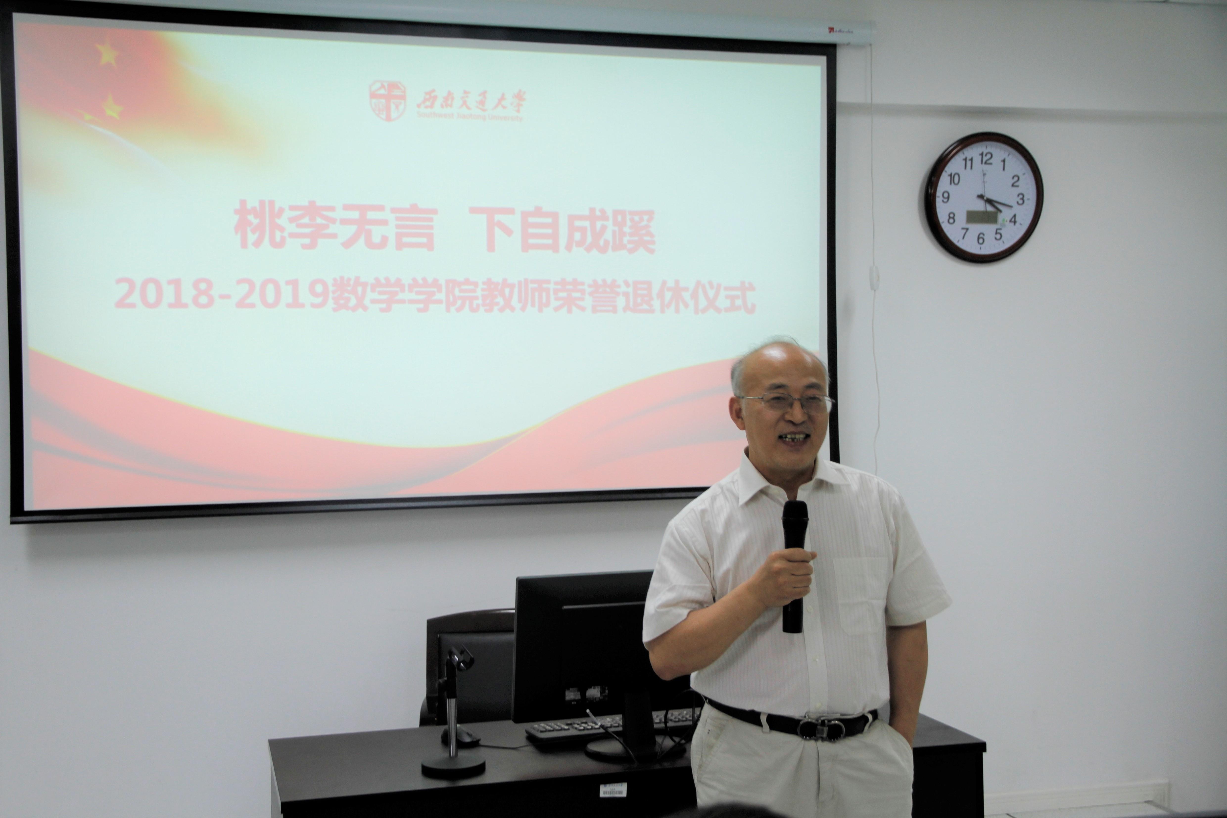 党委书记徐革教授向退休教师们致辞。徐书记代表学院充分地肯定了老教师们多年来在教育事业上所做出的贡献,对几位教师的光荣退休表示了真诚的祝贺。书记在讲话中提到,学院真诚地希望退休老同志在保重身体,颐养天年的同时,继续发挥余热,关心和支持学院工作,为学院各项工作献计献策,做到“退而不休”。此外,徐书记指出学院也将更加重视敬老爱老的工作,努力使退休老师们老有所养、老有所学、老有所为,享受天伦之乐,拥有一个充实幸福的晚年。