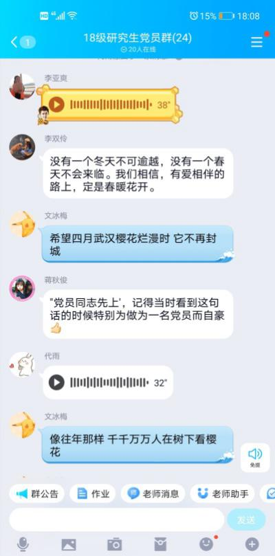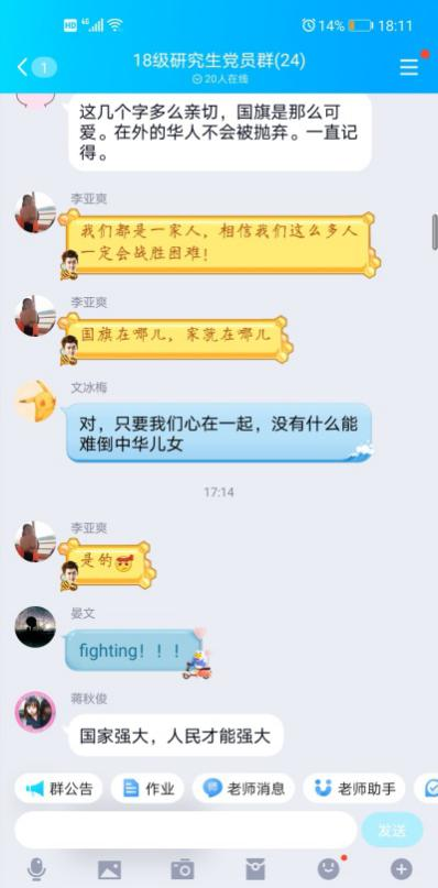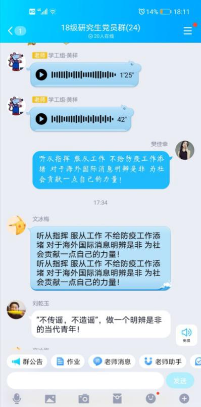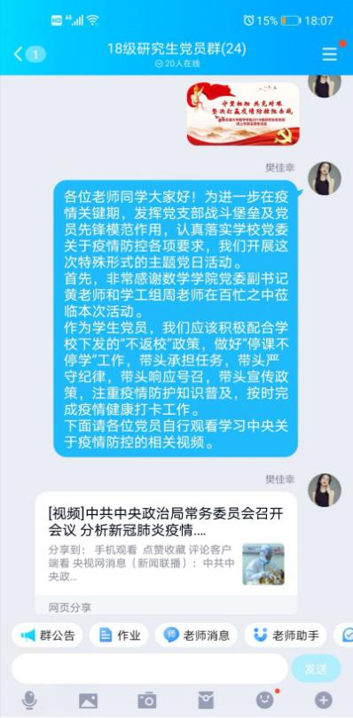 2018级研究生党支部召开疫情防控线上主题党日活动。本次活动以“守望相助,共克时艰,坚决打赢疫情防控阻击战”为主题,依托QQ群聊平台开展,成人直播