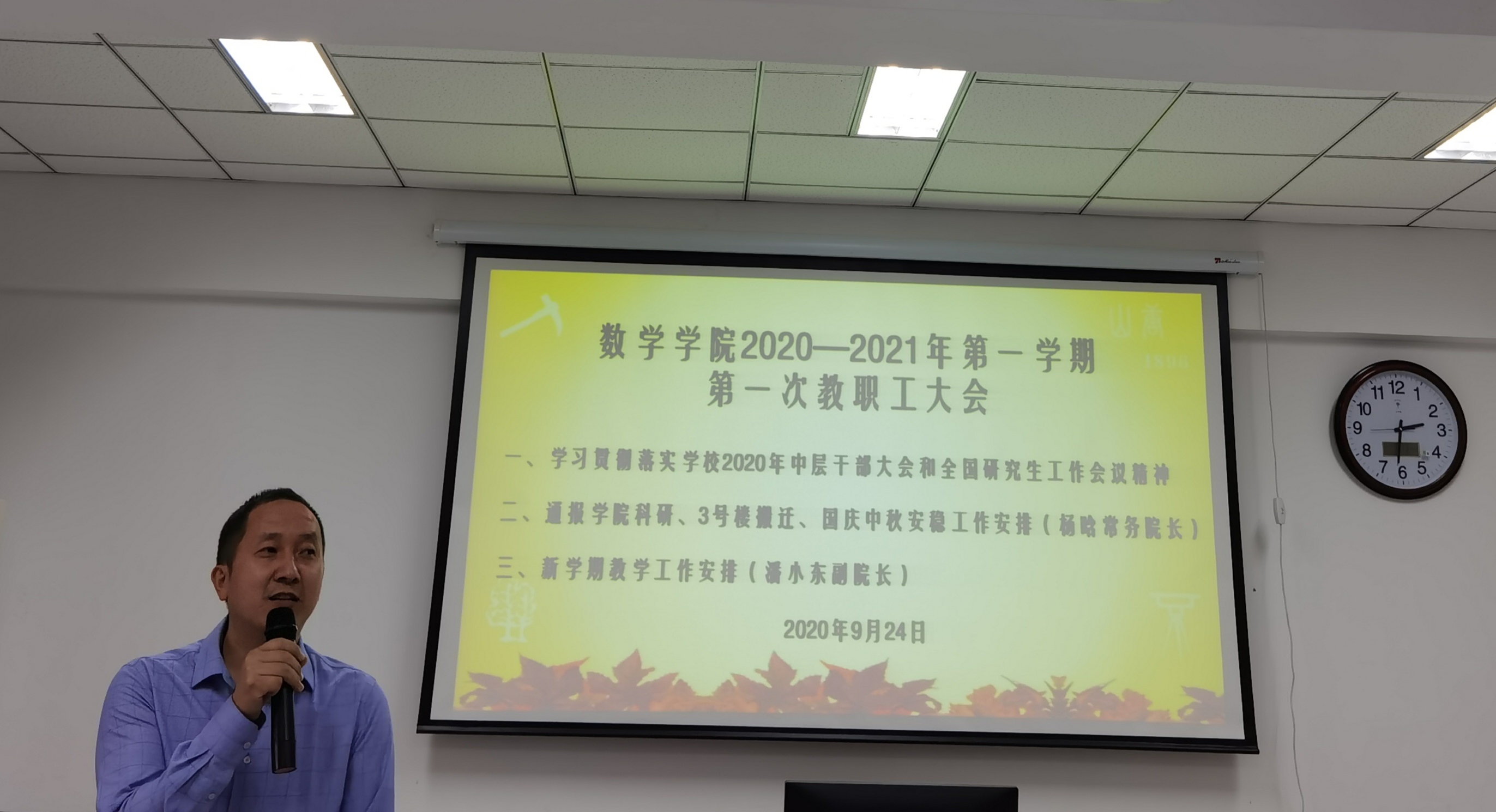 2020-2021年第一学期第一次教职工大会于9月24日在犀浦校区2411召开,会议议题有:1、学习贯彻落实学校2020年中层干部大会和全国研究生工作会议精神;2、通报学院科研、3号楼搬迁、国庆中秋安稳工作安排;3、新学期教学工作安排等。本次会议由学院常务院长杨晗主持。