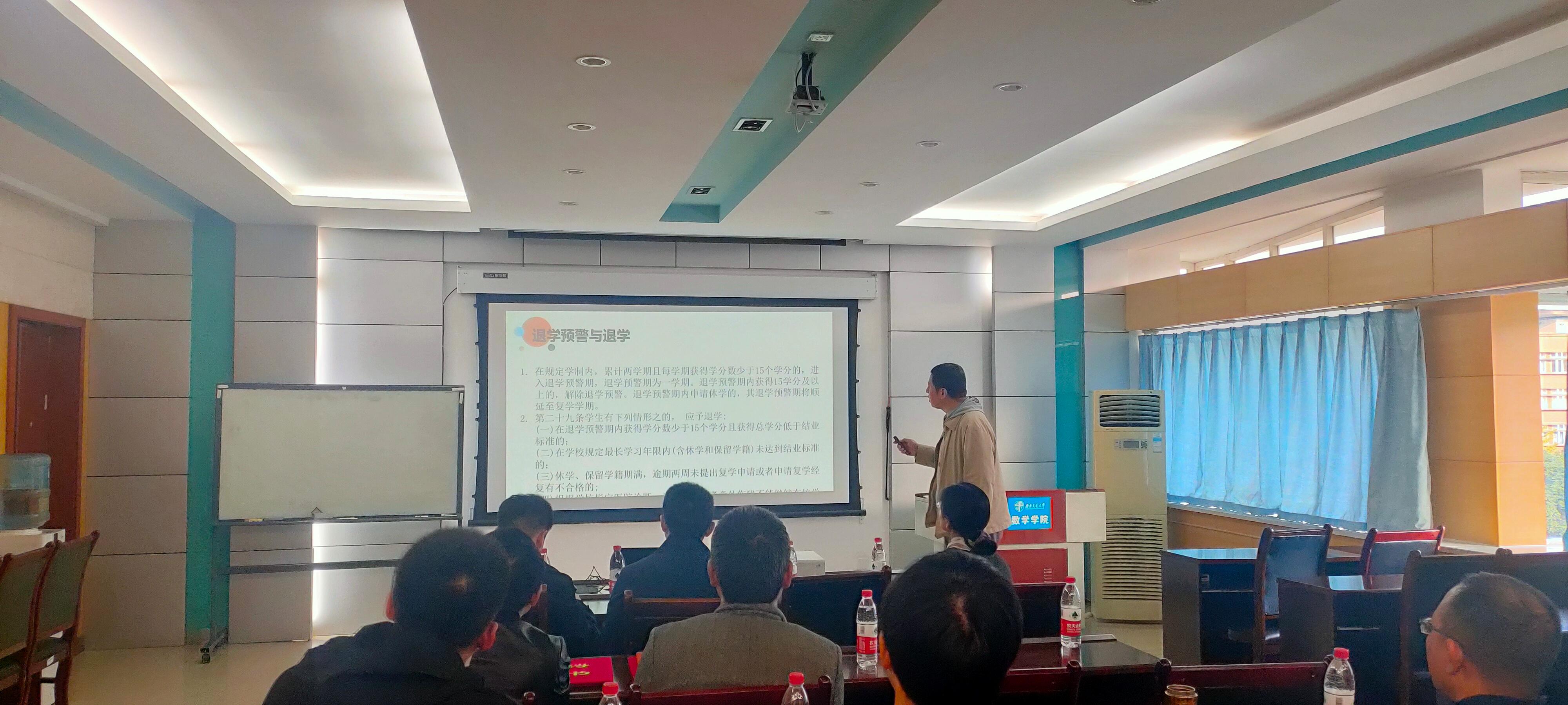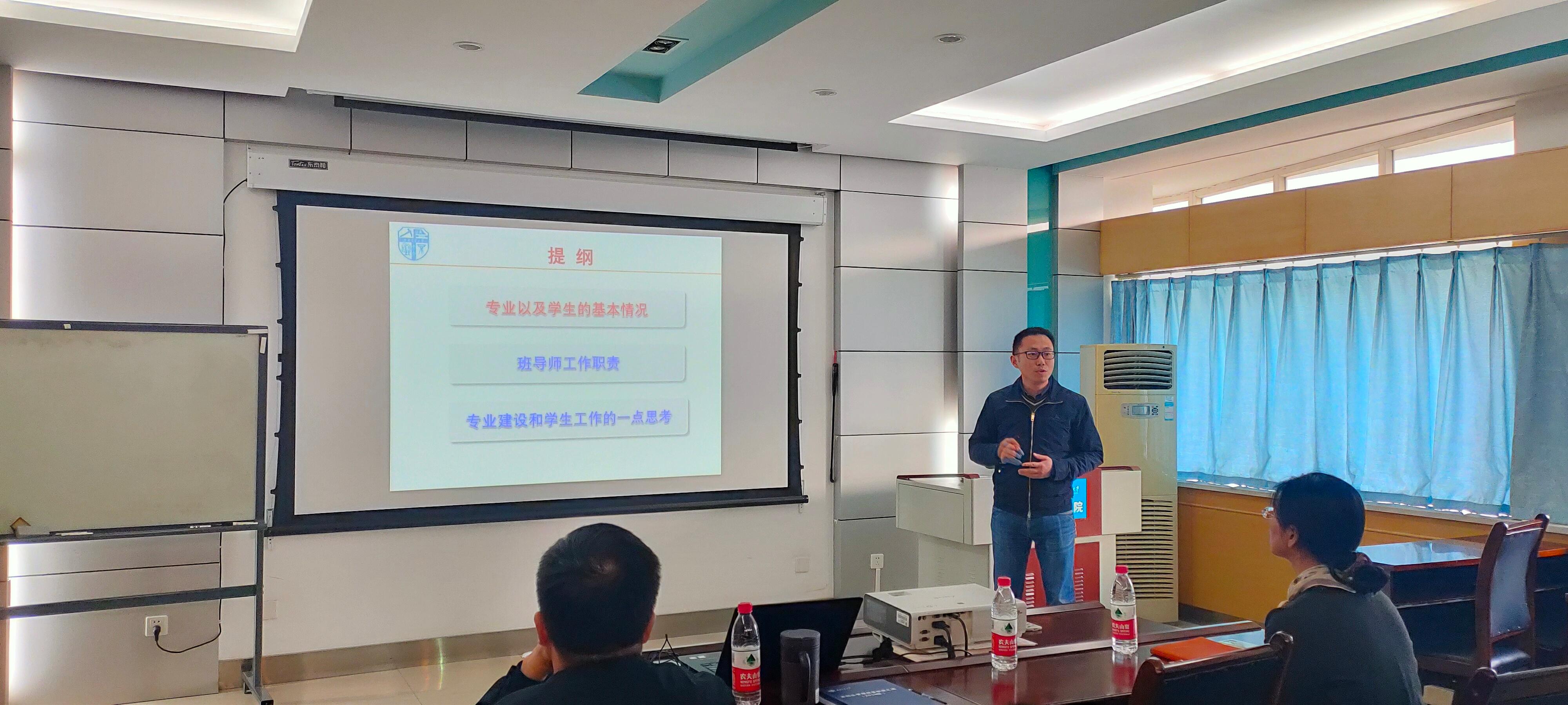本科生班导师工作细则,包括本科生班导师选聘流程,工作职责,工作考核,以及分年级重点工作内容。潘小东副院长介绍了学院本科生的学籍情况、升学就业情况和本科生培养方案。本科教务赵志伟介绍了本科生学籍管理细则。最后与会的老师进行了学生管理工作相关的沟通交流。