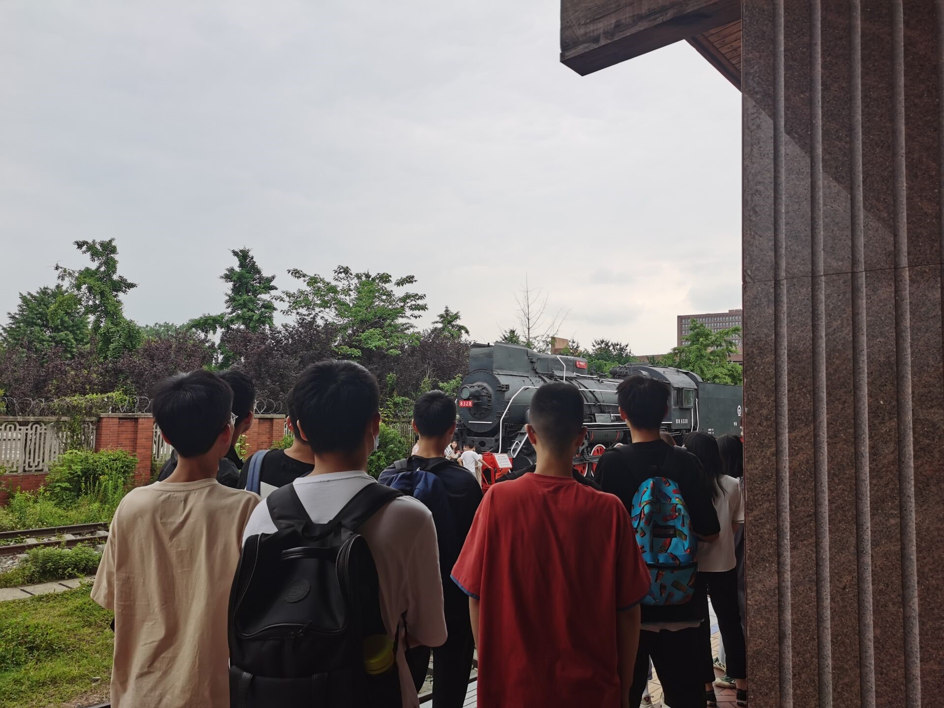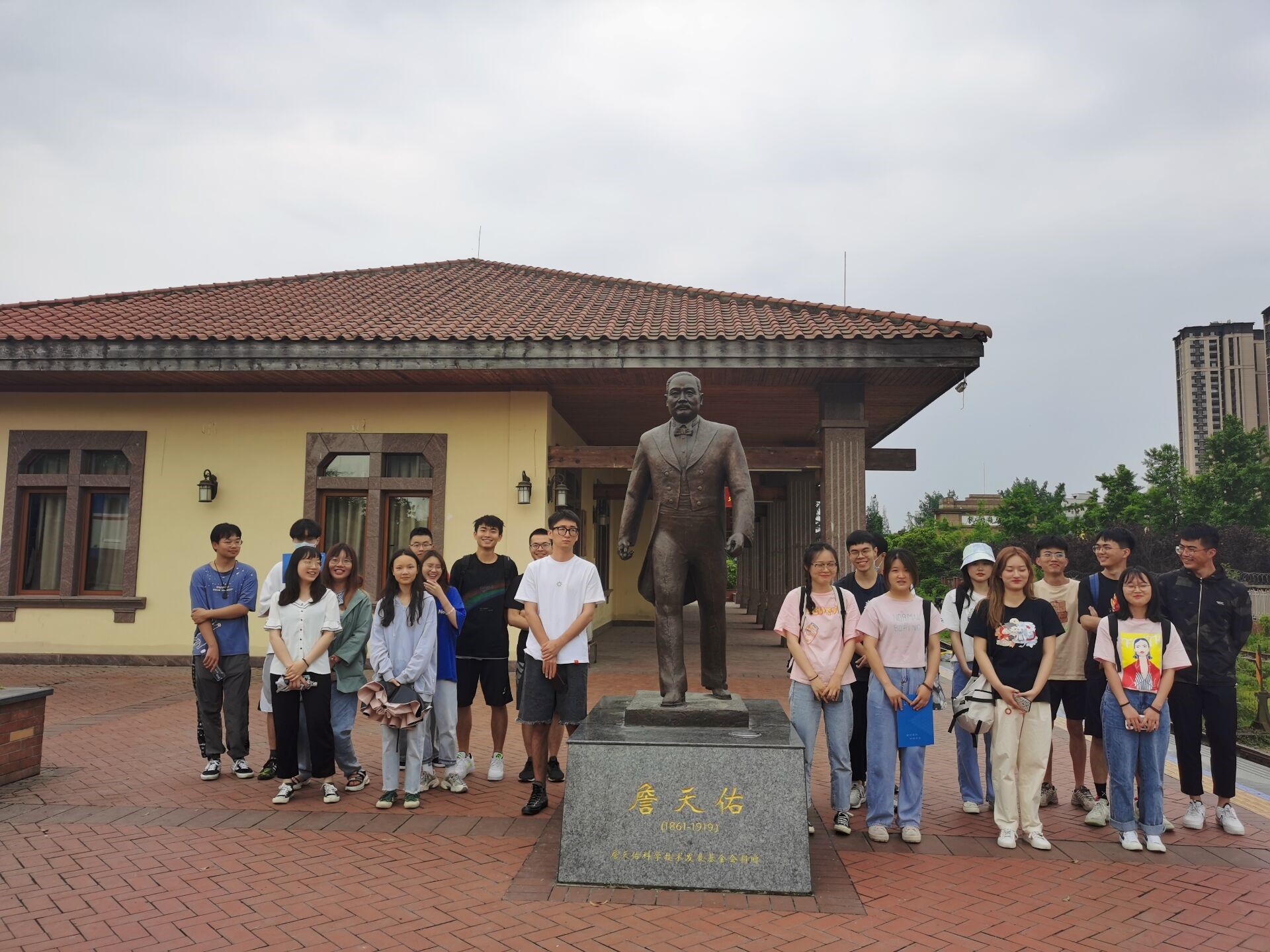 机车博物园作为我国第一个高校机车博物园,是中国博物馆联盟首批成员单位,在犀浦校区南北人文轴的顶端,其联通“竢实扬华”墙、先贤塑像群、校史馆和图书馆,是交大文化宣传的第一站。首先,映入眼帘的就是詹天佑的雕像。先生正阔步向前,衣袂飘扬。在他身后,是一个仿旧月台,以木板吊顶打造,七根梁柱排开,上面依次悬挂着七个交大校址搬迁主要站点。第一个山海关站正对着詹天佑先生的塑像,象征着他当年引领着山海关北洋铁路官学堂(交大前身)在路桥领域深耕细作。支部团员在雕像旁边合影留恋,分分表示会铭记先生当年的精神,奋发进取,力争上游。