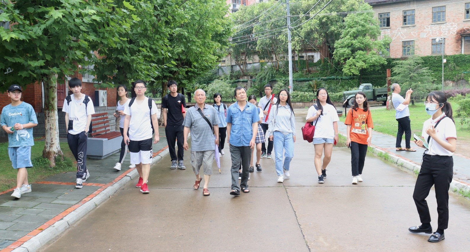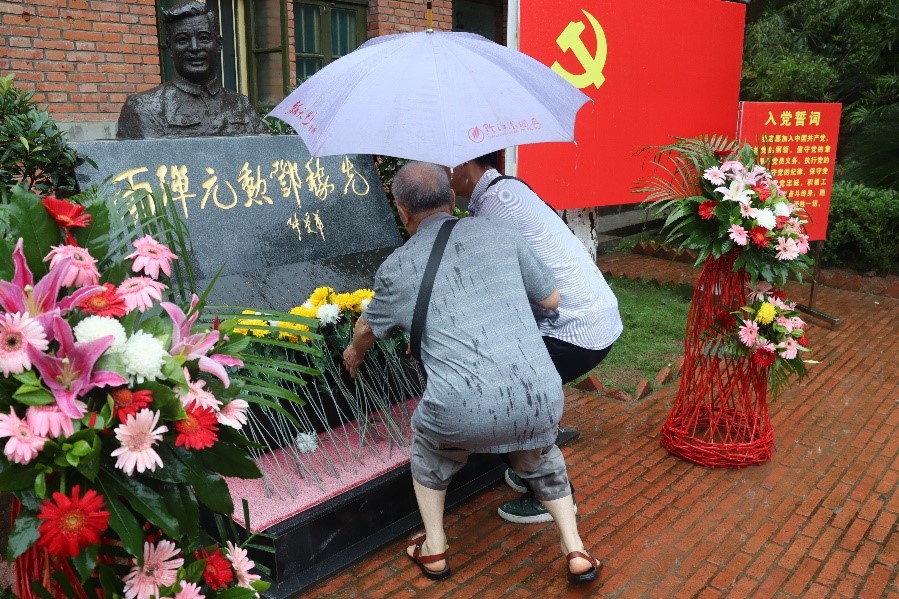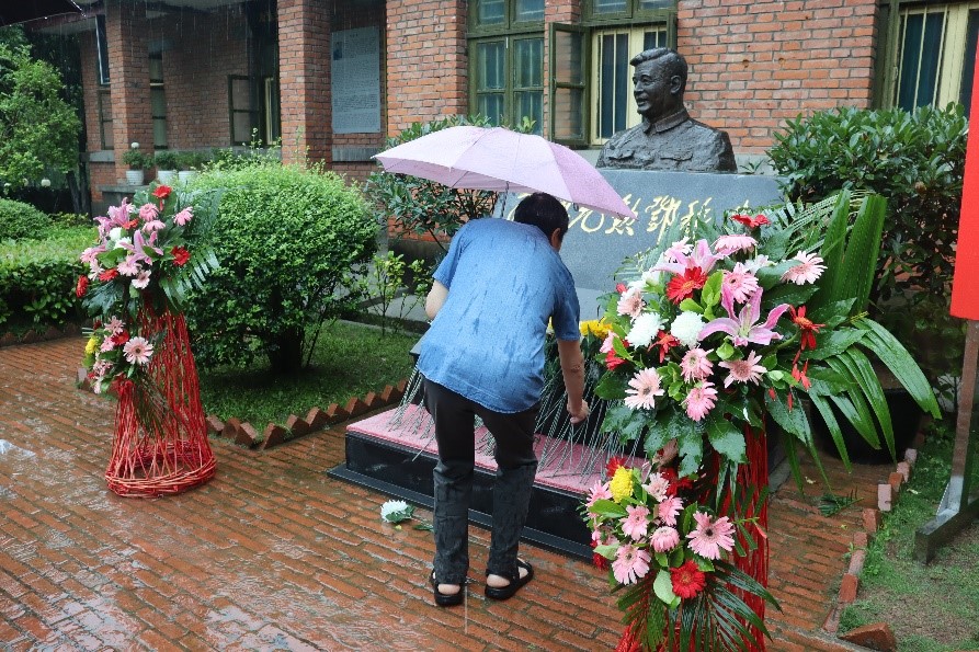 随后,师生们前往邓稼先旧居进行参观。两室一厅的平房,一片香樟和梧桐林,这便是邓稼先曾经的住处。简朴居室的墙上,挂有珍贵的历史资料照片与邓稼先的手稿复印件,展现了他当时丰富的内心世界。参观途中偶遇降雨,师生们在雨水中驻足,向邓稼先塑像致意,敬献花篮,完成献花仪式,向邓稼先表达崇高的敬意与怀念。