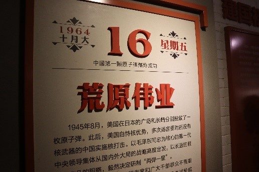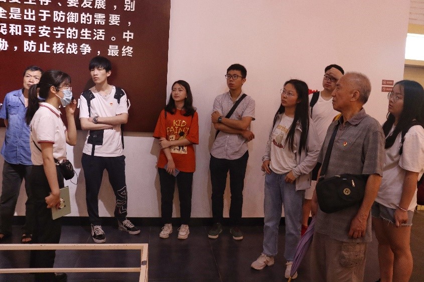 师生们首先参观了两弹历程馆与三防教育展馆。在讲解员的带领下,回顾了建国初期,面临着核讹诈与核威胁,我国的科研工作者将智慧、青春甚至生命奉献给祖国的决心。之后,介绍了以我校校友陈能宽为代表的一系列两弹杰出人才,他们都曾默默奋战在两弹城这个鲜为人知的地方,怀揣拳拳赤子报国心奉献于惊天动地的事业。场馆利用声光电等手段,通过实物、模型、影像资料等方式,向学院师生展现着“两弹”研制工作的艰辛历程。最后,师生们参观了两弹模型。讲解员介绍道:“这是我国第一颗核航弹的模型,长3米,直径1.5米左右,后面就是它爆炸所产生的蘑菇云。”师生们伴随着讲解,近距离感受科学家为两弹事业所做的伟大贡献。