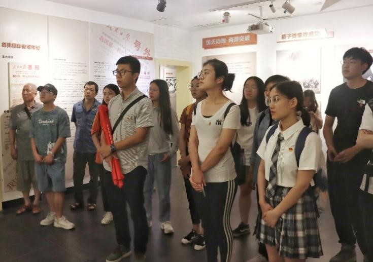 学院师生于7点30分准时集合出发,11点到达两弹城并在门口集合拍照。在“精英门”正上方,“两弹城”三个红色大字在阳光下熠熠生辉。门柱上刻有“红云冲天照九霄,千钧合力地动摇。二十年来勇攀后,二代轻舟已过桥。”这是1984年第二代核武器试验取得成功后,邓稼先满怀豪情写下的诗句。