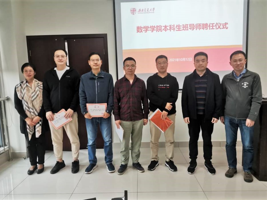 会议第一项,由徐革书记和黄祥副书记为潘志刚、杨萌、李晓斌、韩帮胜、赵君一郎和李从辉老师颁发21级新任班导师聘用证书。