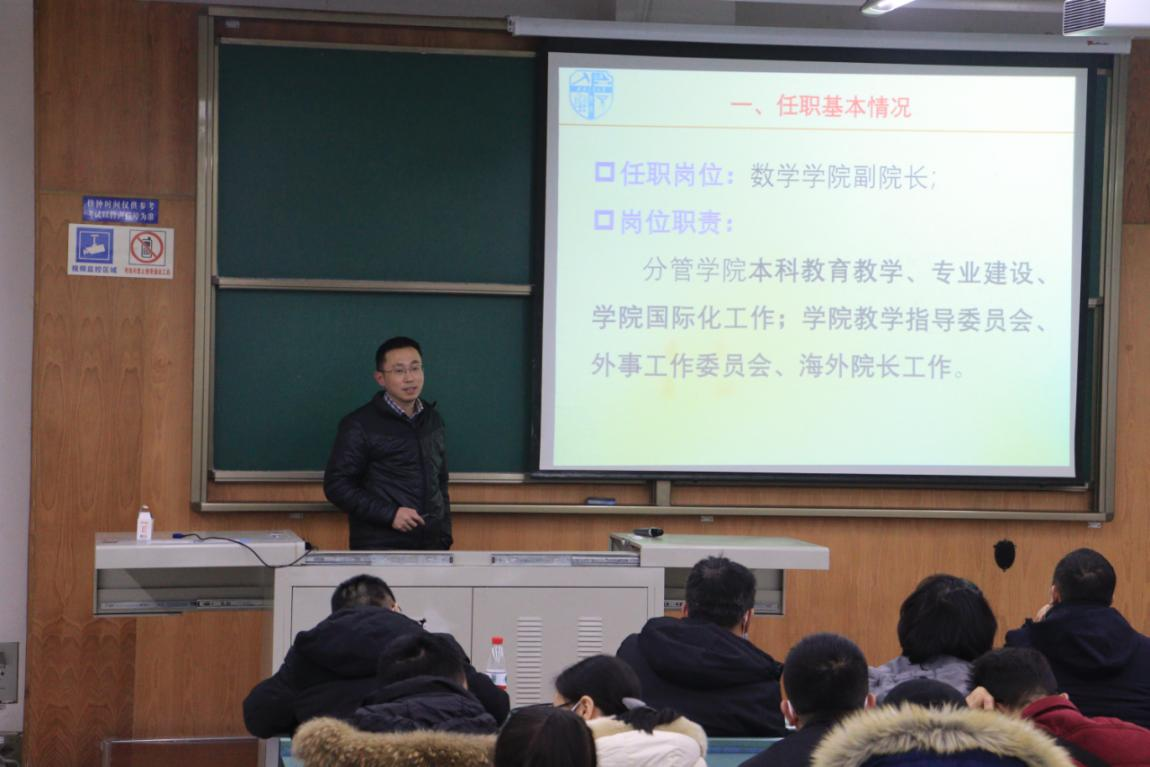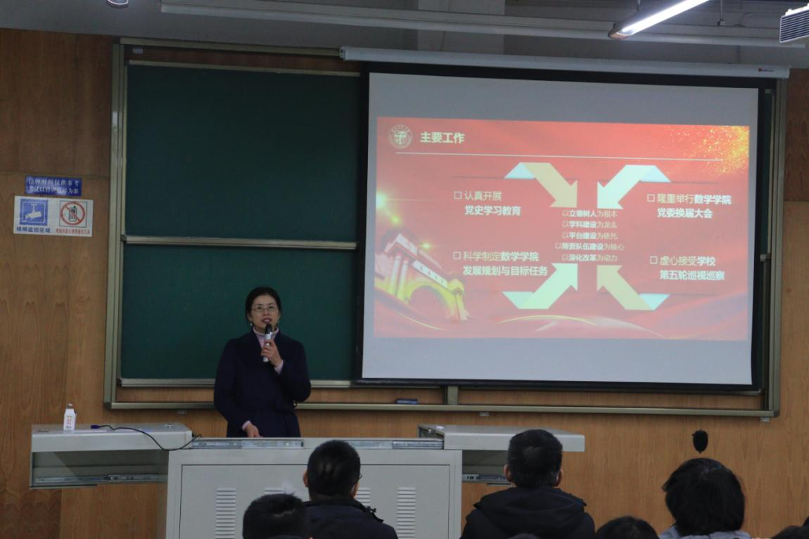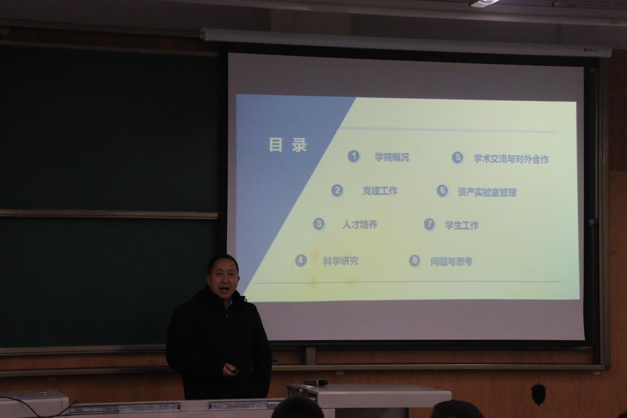 进行汇报,介绍了一年来的学院工作与人才培养,指出学院在学校提出的学科建设思路的引领下,坚持以立德树人为核心,建设高质量教育体系,深入实施“人才强校主战略”,发挥基础学科的强基作用。