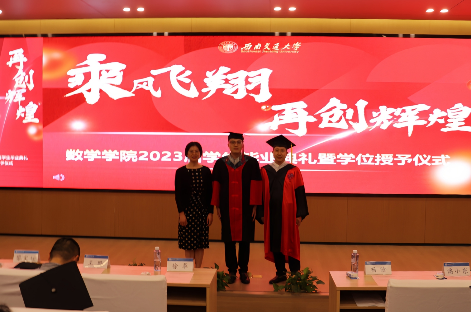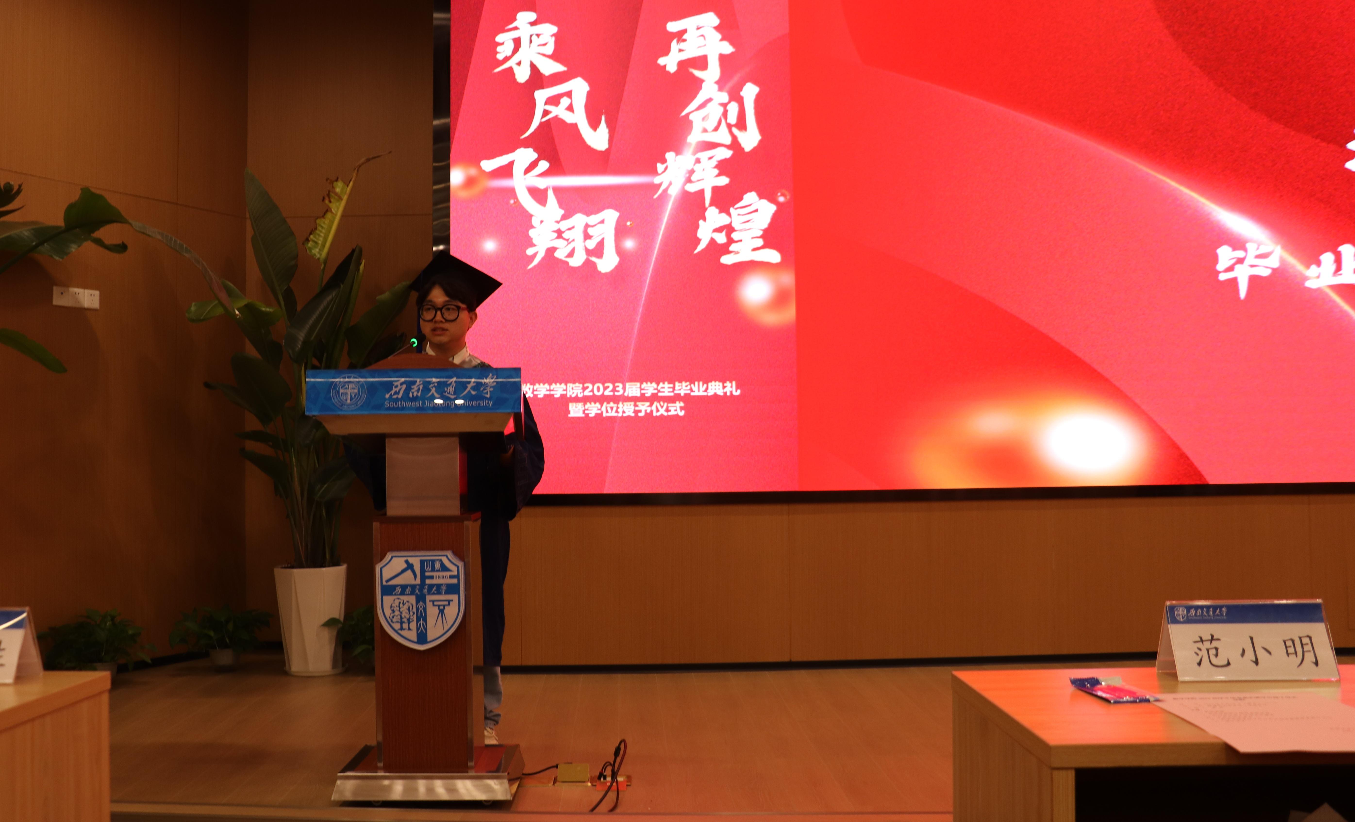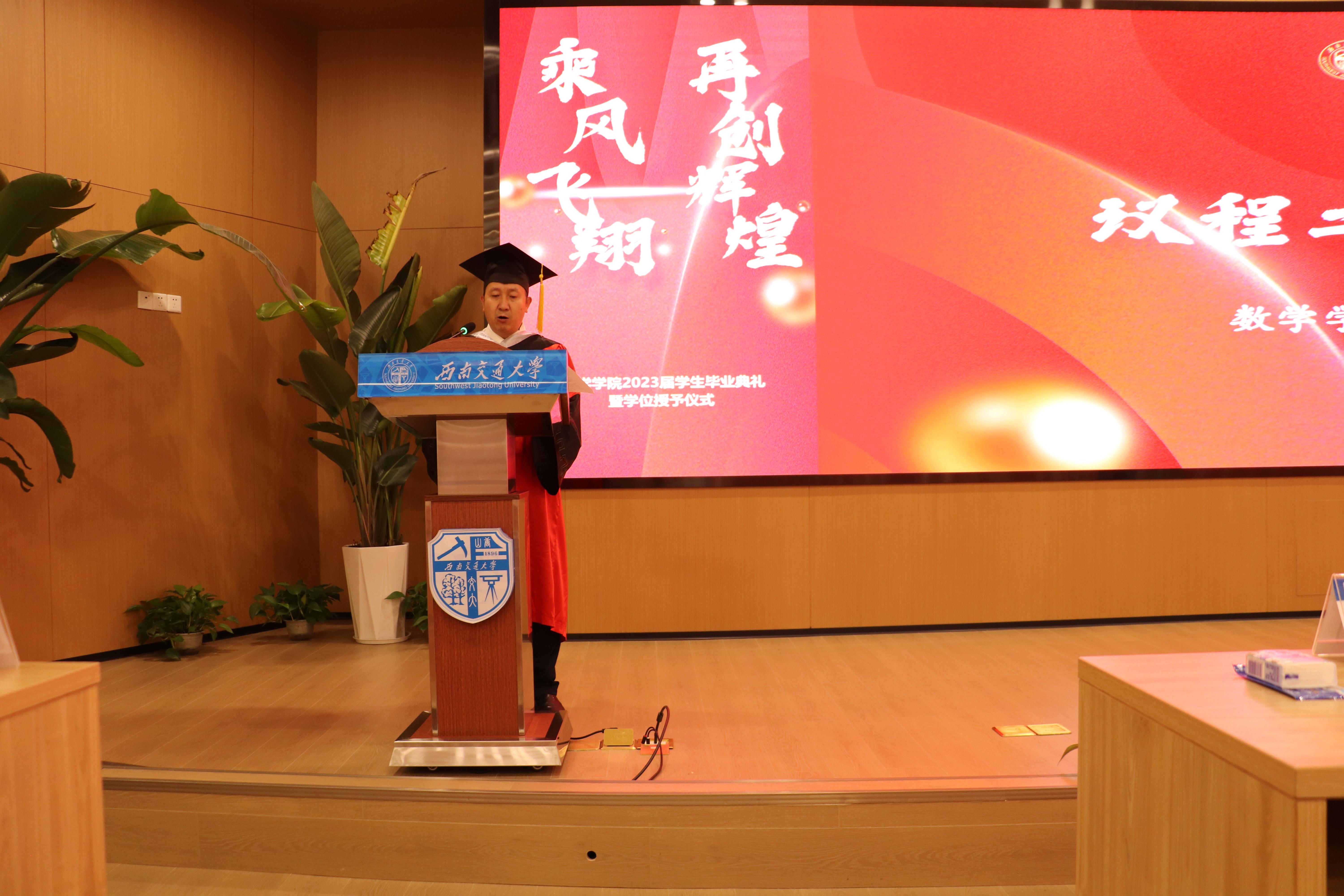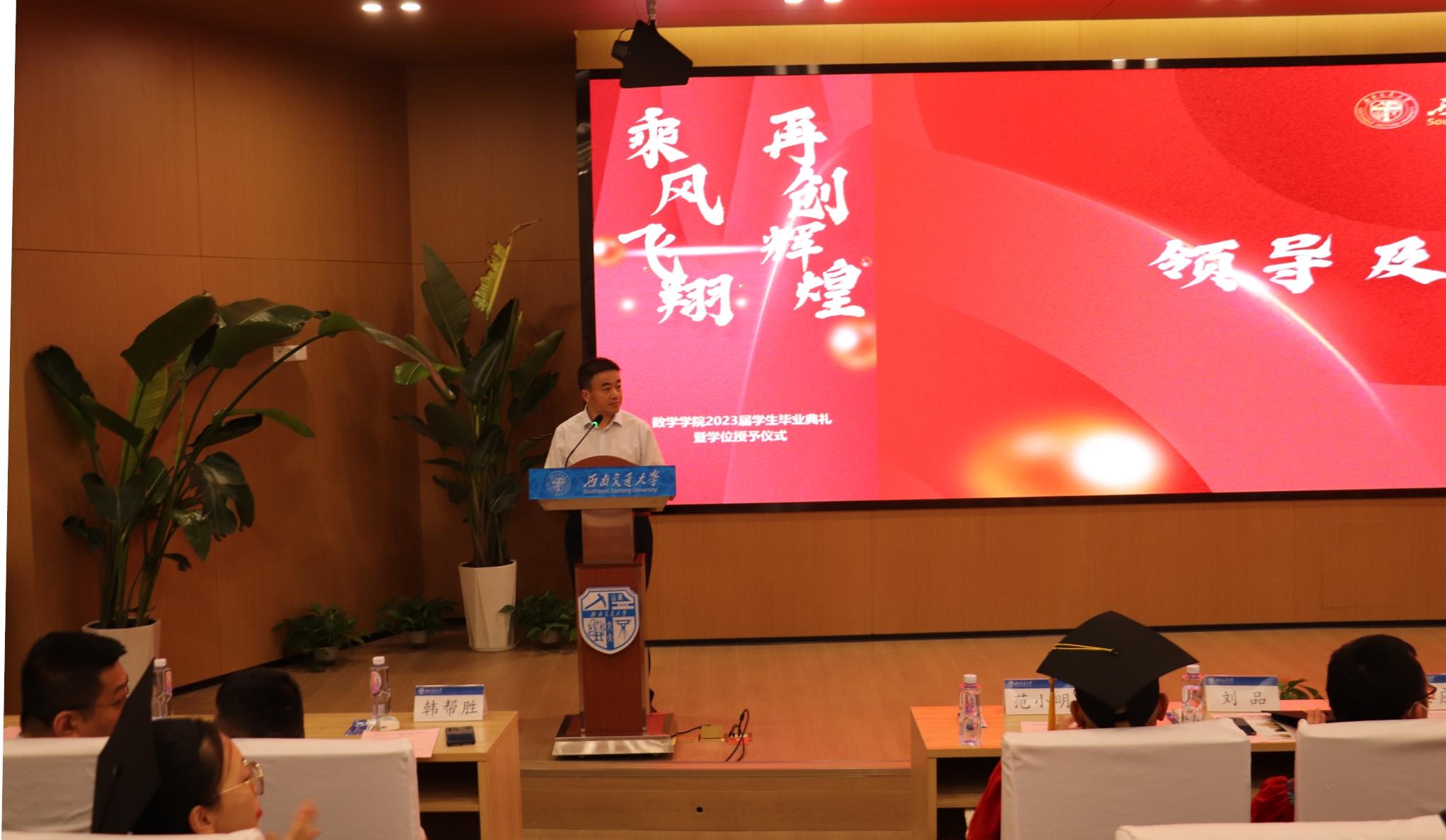 离别之际,杨晗院长祝愿同学们在新的赛道上跑出加速度,书写出更加绚烂多彩的篇章。同时,杨晗院长还叮嘱了同学们三点:一为“立青矜之志,履践致远”,要心系“国家事”、肩扛“国家责”,要以国家富强、人民幸福为己任,胸怀理想,志存高远;二为“行远自迩,踔厉奋发”,应秉持“竢实扬华,自强不息”的交大精神,在实践中增长知识、锤炼品格,以真才实学服务人民,以创新创造贡献国家;三为“奋楫笃行,臻于至善”,要学会感恩伟大的祖国、感恩伟大的时代,感恩陪伴多年的母校,感恩辛勤付出的老师,把青春奋斗融入到党和人民事业中,为国家发展聚能、为民族复兴蓄力。他提到,新时代青年将接过先辈手中的接力棒,坚定理想信念,从“国之大者”中寻找方向,扛起这份报效祖国的责任。杨晗院长表示,交大永远是同学们最温暖的港湾,交大数院也期盼与各位同学共同走向辉煌!最后,杨晗院长再次向2023届毕业生们致以诚挚的祝贺。